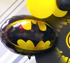 تجهيز عيد ميلاد باتمان مميز مع بالونات صفراء وسوداء وخلفية بطل خارق. تنسيق مثالي لحفلات الأطفال وإضافة أجواء بطولية تجعل الاحتفال ممتعًا ومناسبًا لعشاق باتمان في أعياد الميلاد.