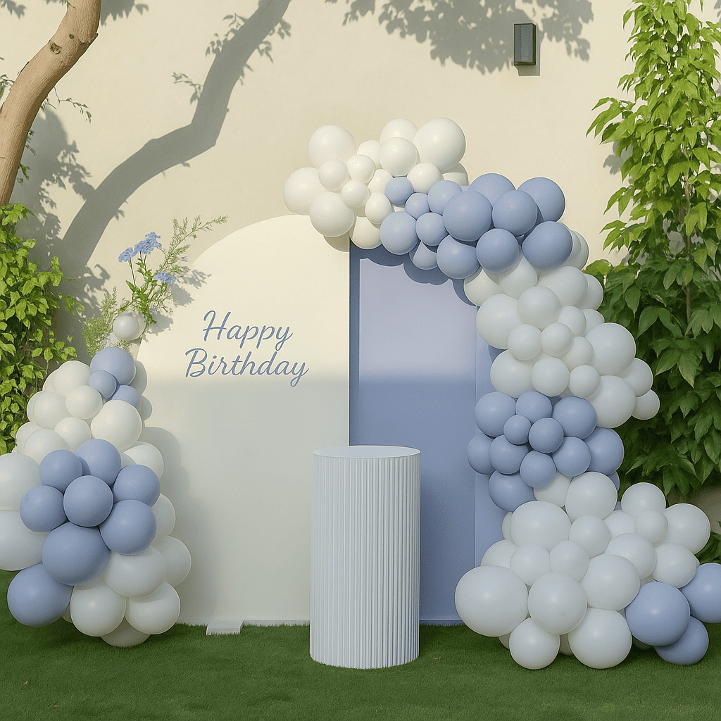 قوس بالونات بألوان باستيل هادئة وتصميم أنيق مثالي لحفلات عيد الميلاد في الهواء الطلق. خلفية عصرية مع منصة للتصوير تمنح المكان لمسة راقية وبسيطة. مناسب للحفلات ذات الطابع الهادئ والفخم.قوس بالونات بألوان باستيل هادئة وتصميم أنيق مثالي لحفلات عيد الميلاد في الهواء الطلق. خلفية عصرية مع منصة للتصوير تمنح المكان لمسة راقية وبسيطة. مناسب للحفلات ذات الطابع الهادئ والفخم.