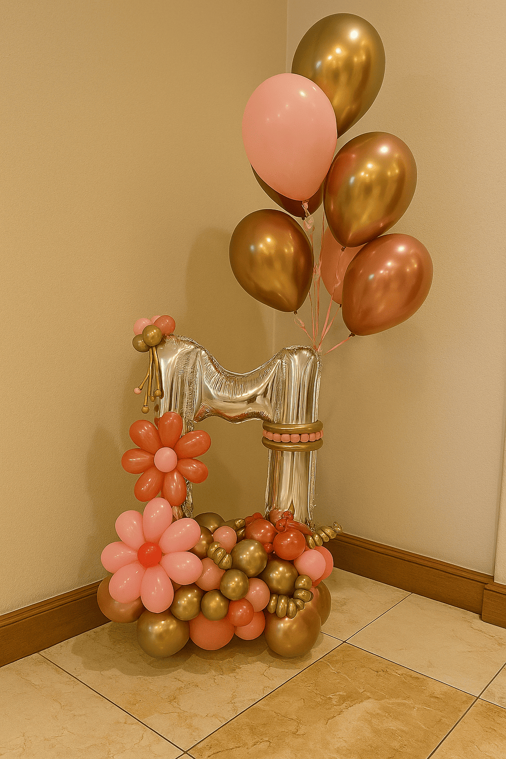 تنسيق جميل من البالونات بدرجات الكورال والوردي والذهبي، يتوسطه حرف كبير باللون الفضي ولمسات من الزهور البالونية الراقية. تصميم أنيق يضيف لمسة من الجمال والرقي لأي احتفال خاص أو عيد ميلاد مميز.