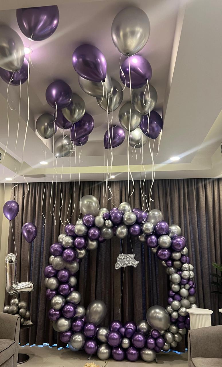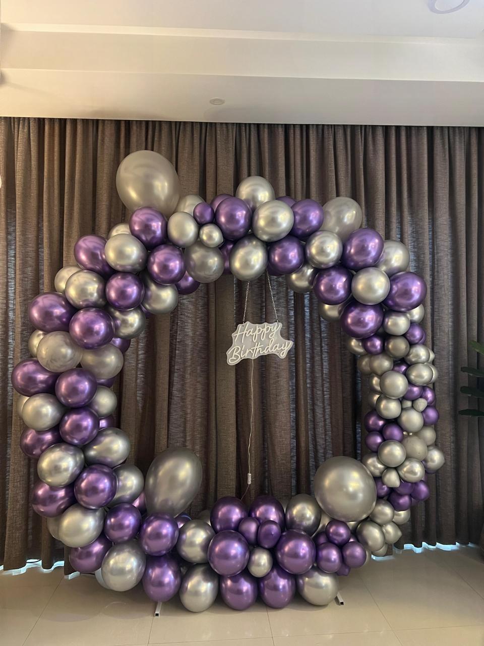حلقة بالونات راقية بتنسيق جميل من البالونات المعدنية باللونين البنفسجي والفضي، مثالية لاحتفالات أعياد الميلاد. يضيف هذا الديكور لمسة عصرية لأي حفلة ويساعد في صنع خلفية مميزة وجميلة لعيد الميلاد.