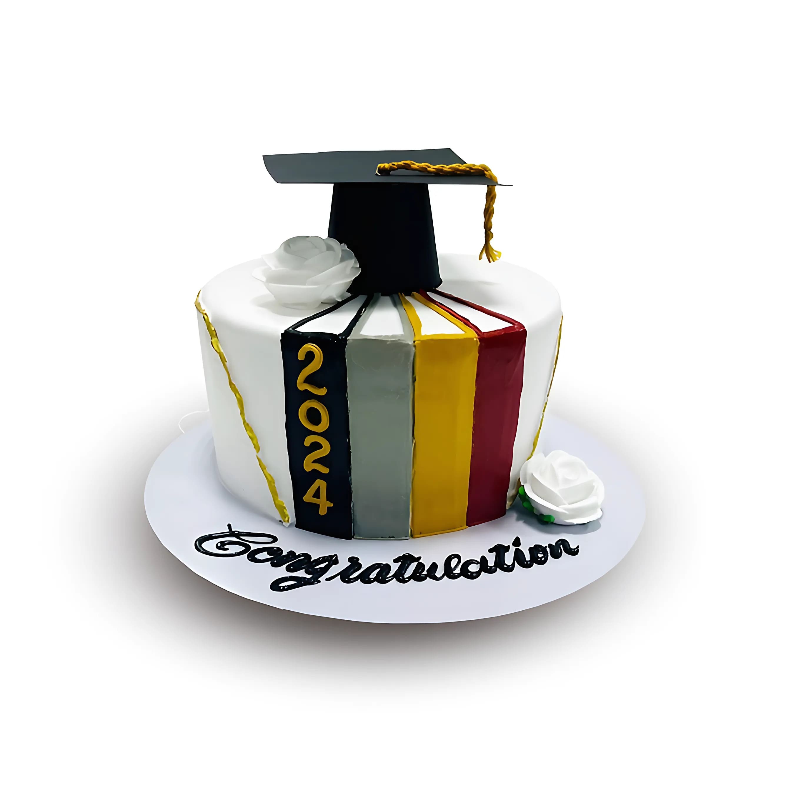 كيكة بيضاء مزينة بخطوط رأسية بارزة بألوان الأسود، الرمادي، الذهبي، والعنابي، مع رقم السنة بخط ذهبي. تعلوها قبعة تخرج وورود بيضاء أنيقة، وقاعدة مكتوب عليها "مبروك التخرج" تكفي لعدد ٢٥ شخص