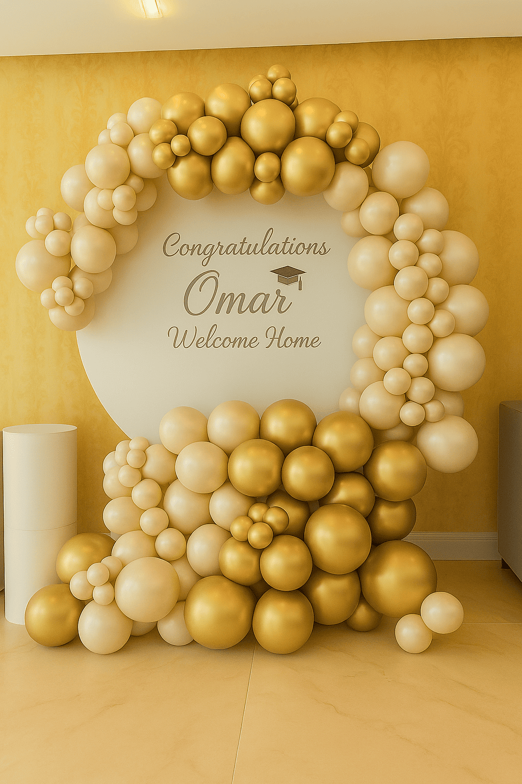 تنسيق راقٍ لحفل التخرج يتميز بقوس بالونات ذهبي وعاجي مع خلفية دائرية أنيقة. ديكور تخرج مثالي لاحتفال التخرج واستقبال الخريج وخلفية تصوير فخمة، ويضفي طابعًا مميزًا على حفل التخرج بأسلوب عصري.
