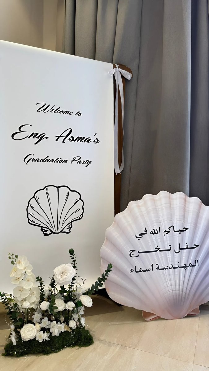 تنسيق استقبال تخرج أنيق يتضمن لوحة قماشية مخصصة بتصميم صدفي وزهور بيضاء راقية. مثالي لحفلات التخرج والاحتفالات الرسمية داخل القاعات