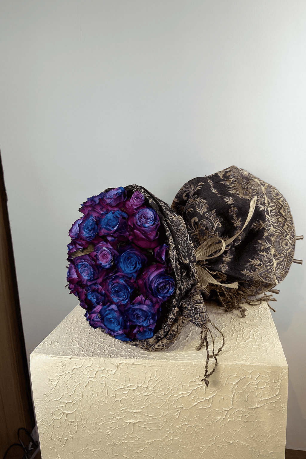 باقة أنيقة من الورود البنفسجية والزرقاء، تحمل لمسة عصرية وتفاصيل مبهرة تلفت الأنظار