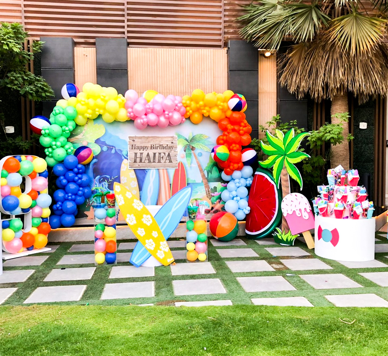 ديكور استوائي يحوّل أي عيد ميلاد إلى احتفال صيفي مليء بالألوان والمرح! تصميم مليء بالبالونات الزاهية وأشجار النخيل والأجواء المنعشة، مثالي لحفلات الخارج المليئة بالطاقة والبهجة.ديكور استوائي يحوّل أي عيد ميلاد إلى احتفال صيفي مليء بالألوان والمرح! تصميم مليء بالبالونات الزاهية وأشجار النخيل والأجواء المنعشة، مثالي لحفلات الخارج المليئة بالطاقة والبهجة.