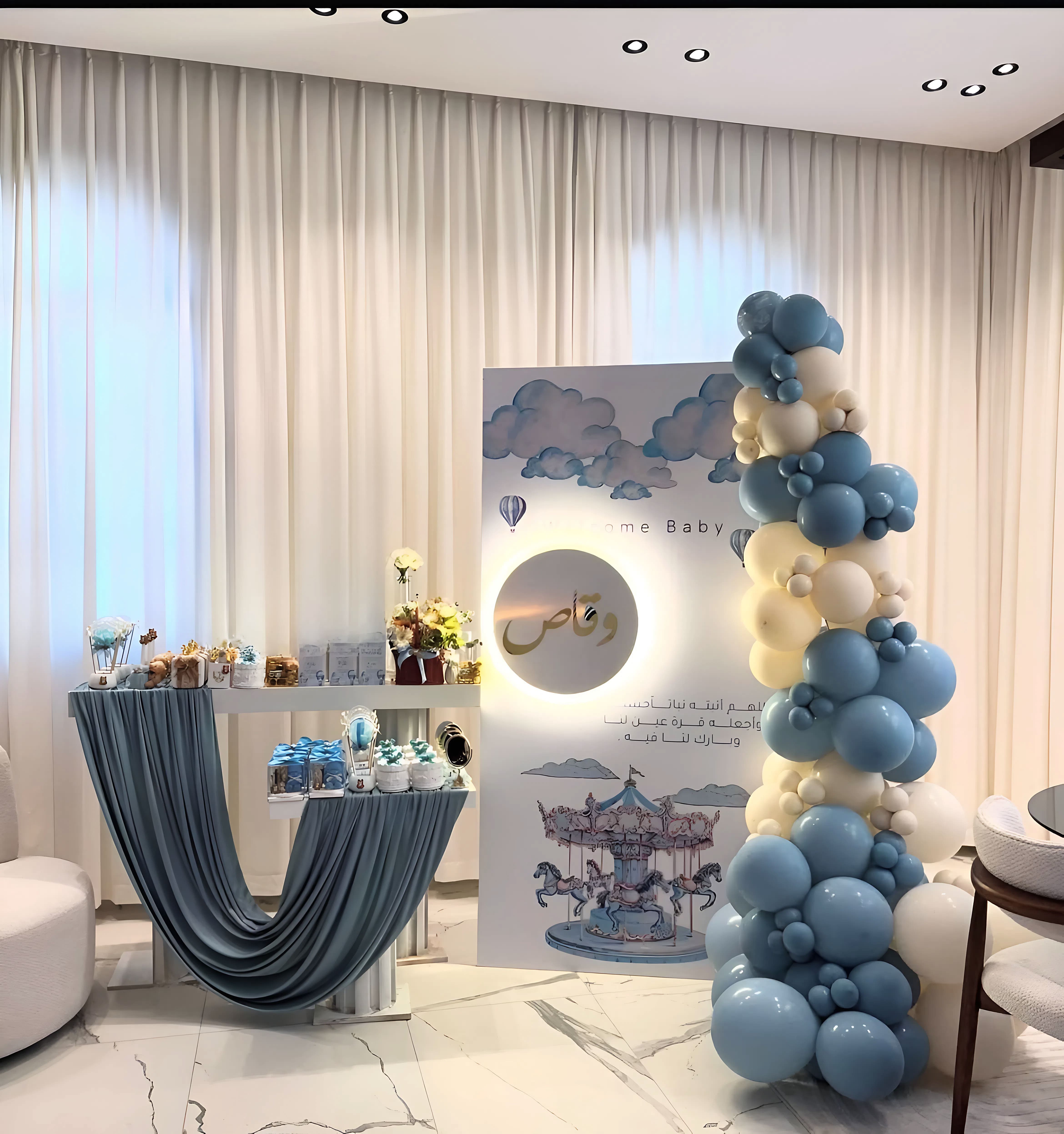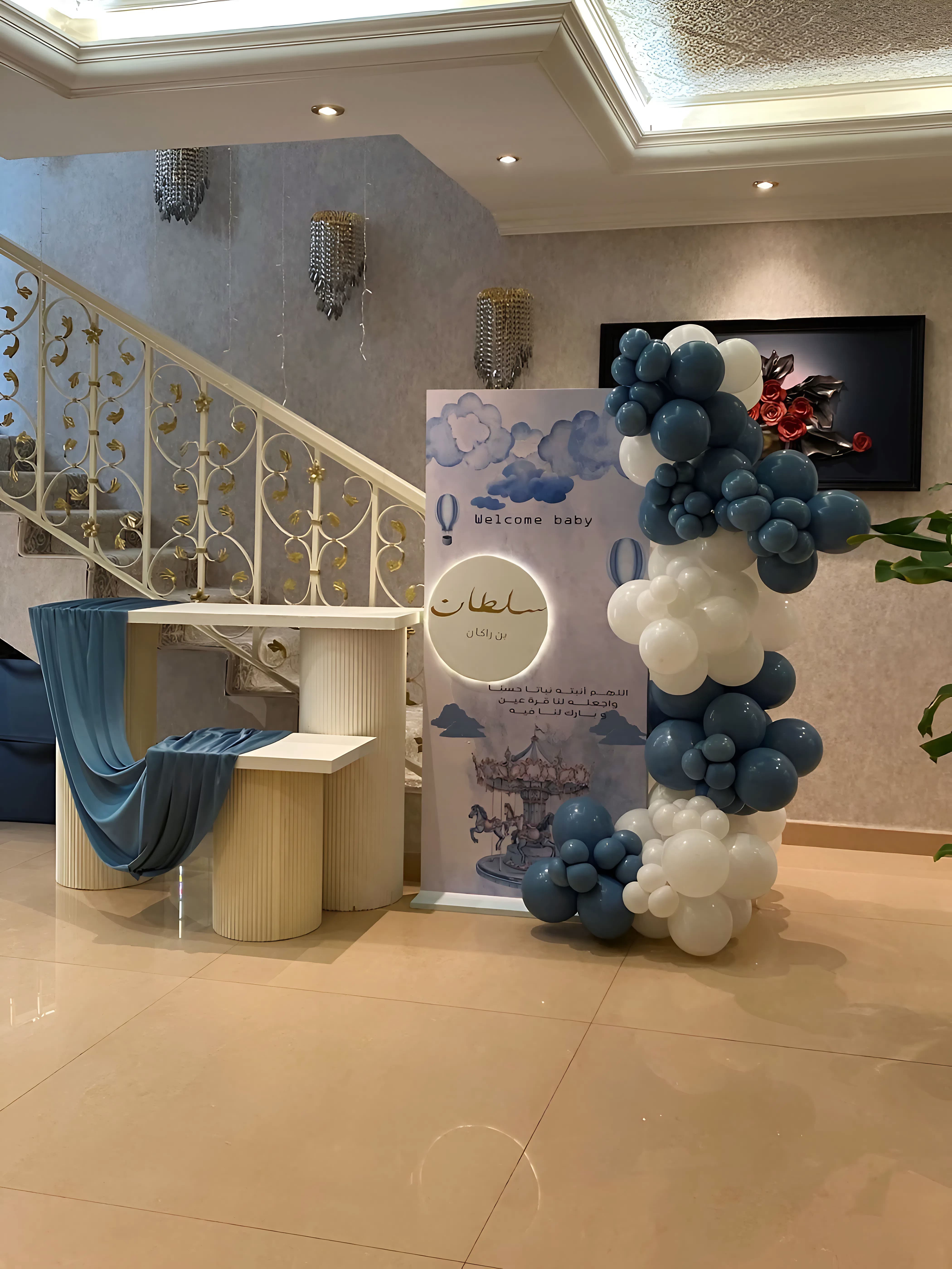 تصميم استقبال مولود أنيق بدرجات الأزرق والأبيض مستوحى من السحاب. ديكور ناعم ومميز مثالي لاستقبال المولود بالبيت أو للمناسبات الخاصة بأجواء راقية وهادية مليانة فرح وحب.تصميم استقبال مولود أنيق بدرجات الأزرق والأبيض مستوحى من السحاب. ديكور ناعم ومميز مثالي لاستقبال المولود بالبيت أو للمناسبات الخاصة بأجواء راقية وهادية مليانة فرح وحب.