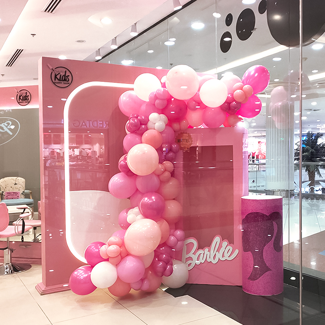 تزيين حفلة عيد ميلاد باربي مع بالونات وردية وصندوق باربي مميز. مثالي لاحتفال عيد ميلاد للأطفال مع ديكور جميل يضيف المرح والأناقة لحفلة عيد ميلاد باربي رائعة.