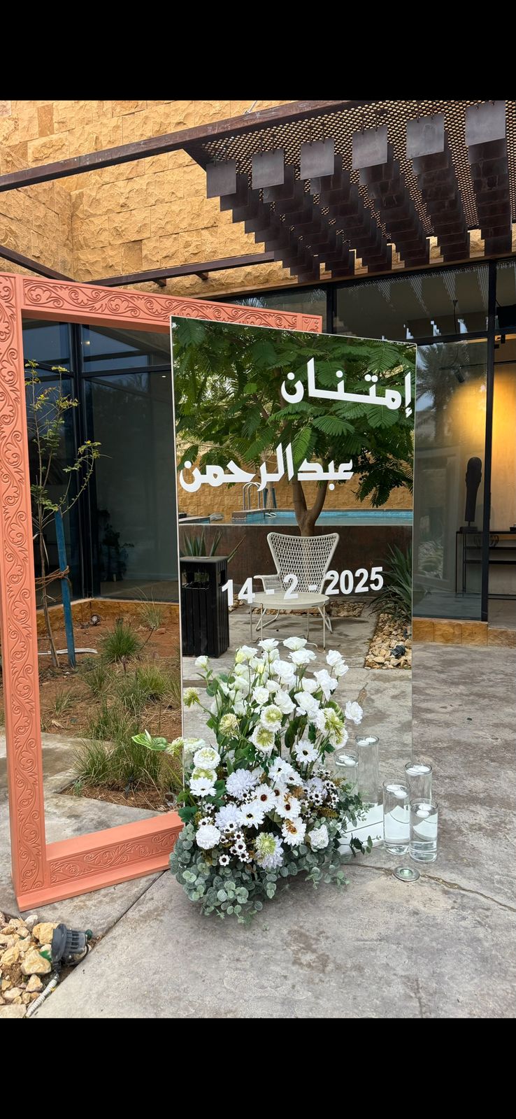 لوحة ترحيب فاخرة بمرآة عاكسة مزينة بالزهور البيضاء والشموع، مثالية لحفلات الزواج، الخطوبة، الاستقبالات والمناسبات الخاصة. تضيف لمسة راقية لديكور الحفل وتمنح الضيوف ترحيباً أنيقاً يعكس جمال الاحتفال وروح المناسبة.