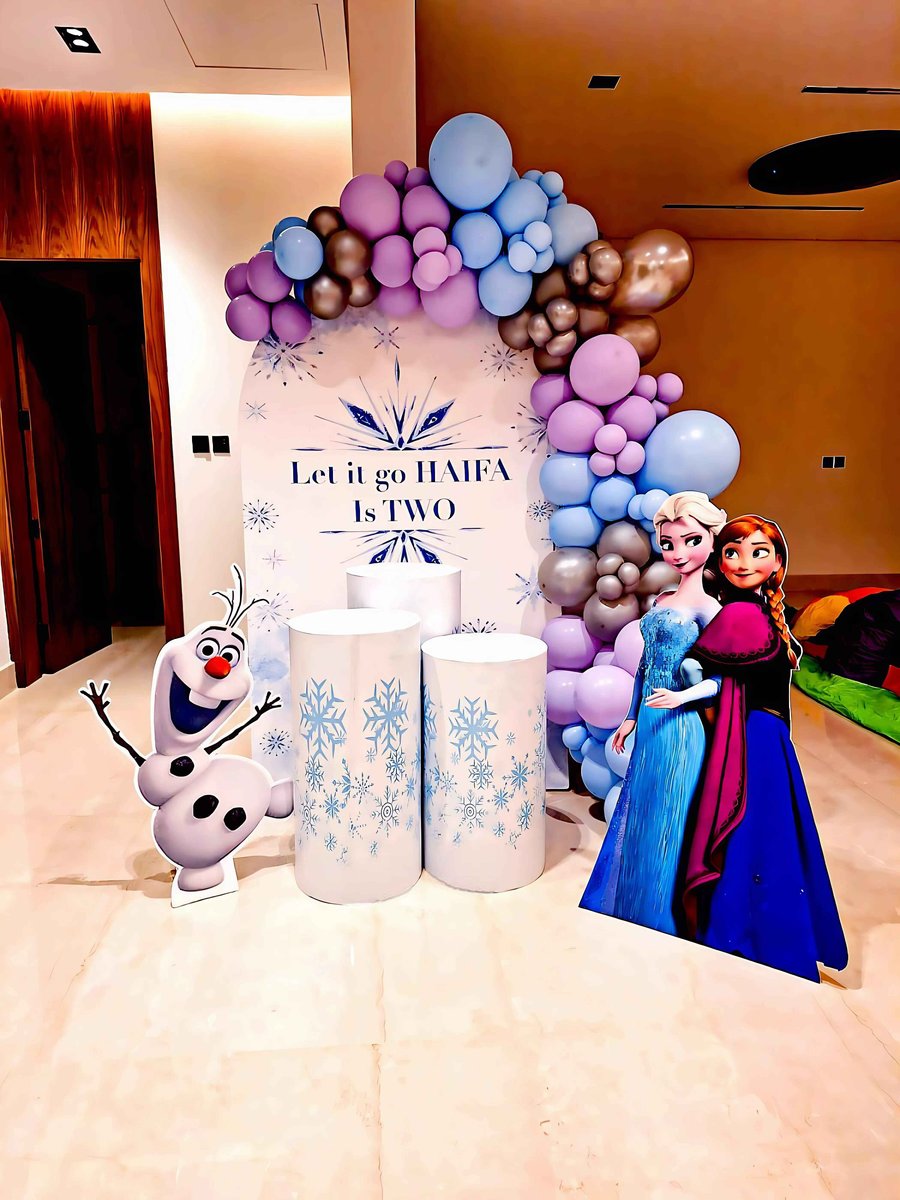 ديكور عيد ميلاد مستوحى من فيلم فروزن مع إلسا وآنا وأولاف وبالونات بألوان الجليد. مثالي لحفلات الأطفال ويمنح أجواء ساحرة وممتعة لأي احتفال بعيد ميلاد بديكور فروزن الساحر.ديكور عيد ميلاد مستوحى من فيلم فروزن مع إلسا وآنا وأولاف وبالونات بألوان الجليد. مثالي لحفلات الأطفال ويمنح أجواء ساحرة وممتعة لأي احتفال بعيد ميلاد بديكور فروزن الساحر.