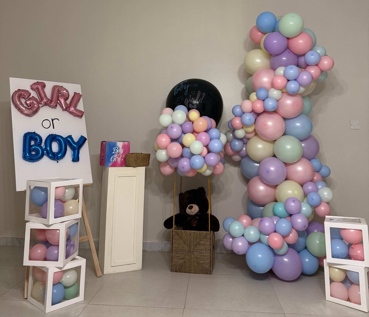 تصميم ناعم بألوان الباستيل مع ديكور تيدي بير وصناديق بالونات أنيقة. مثالي لحفلات الكشف عن المولود أو البيبي شو المنزلي بأجواء دافئة وملونة.