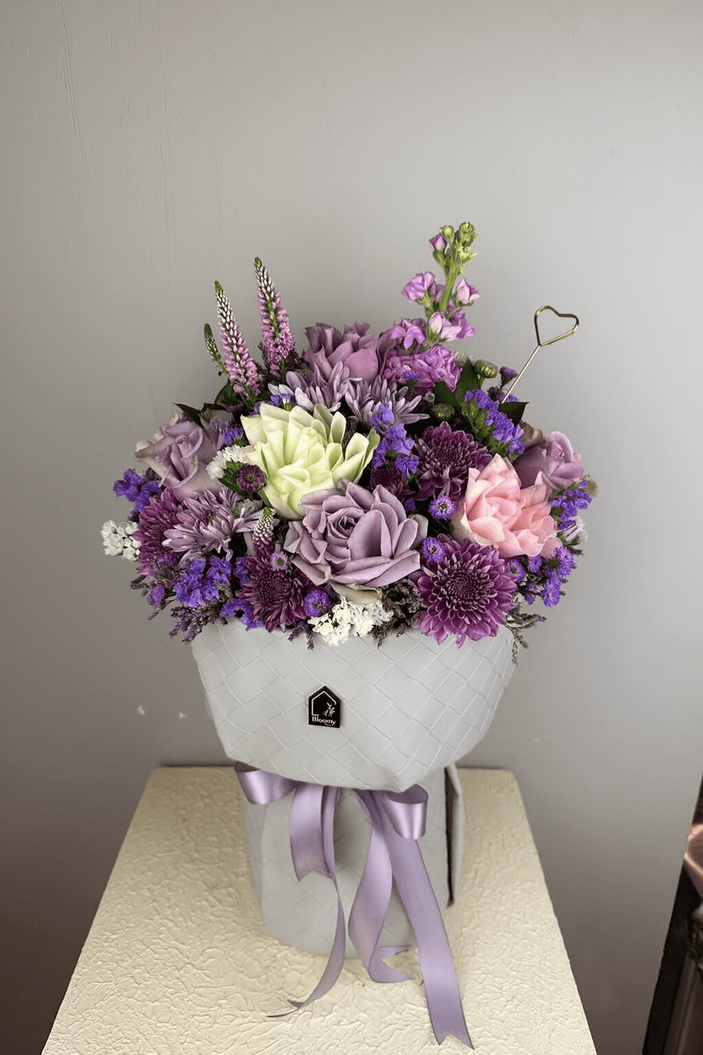 باقة فاخرة من الورد الجوري البنفسجي والوردي مع لمسات بيضاء، تعكس الأناقة والرومانسية.