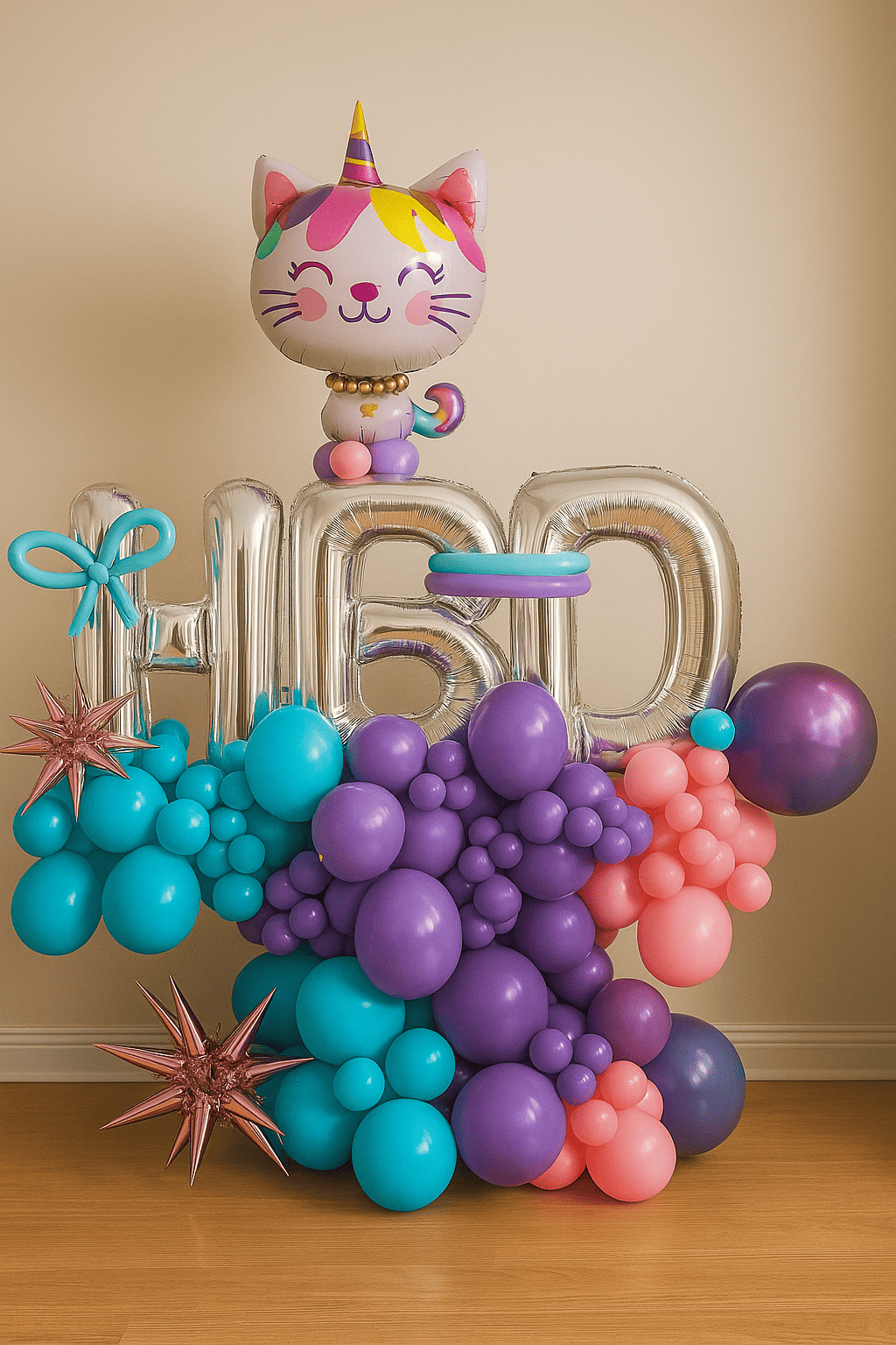 تناسق بالونات مميز بلمسة القطة اليونيكورن اللطيفة، مع حروف بالونية فضية لهابي بيرثداي وتداخل رائع بين ألوان البنفسجي والتركواز والوردي. مزوّد بلمسات زخرفية لامعة تمنحه طابعًا سحريًا مناسبًا لحفلات الأطفال.