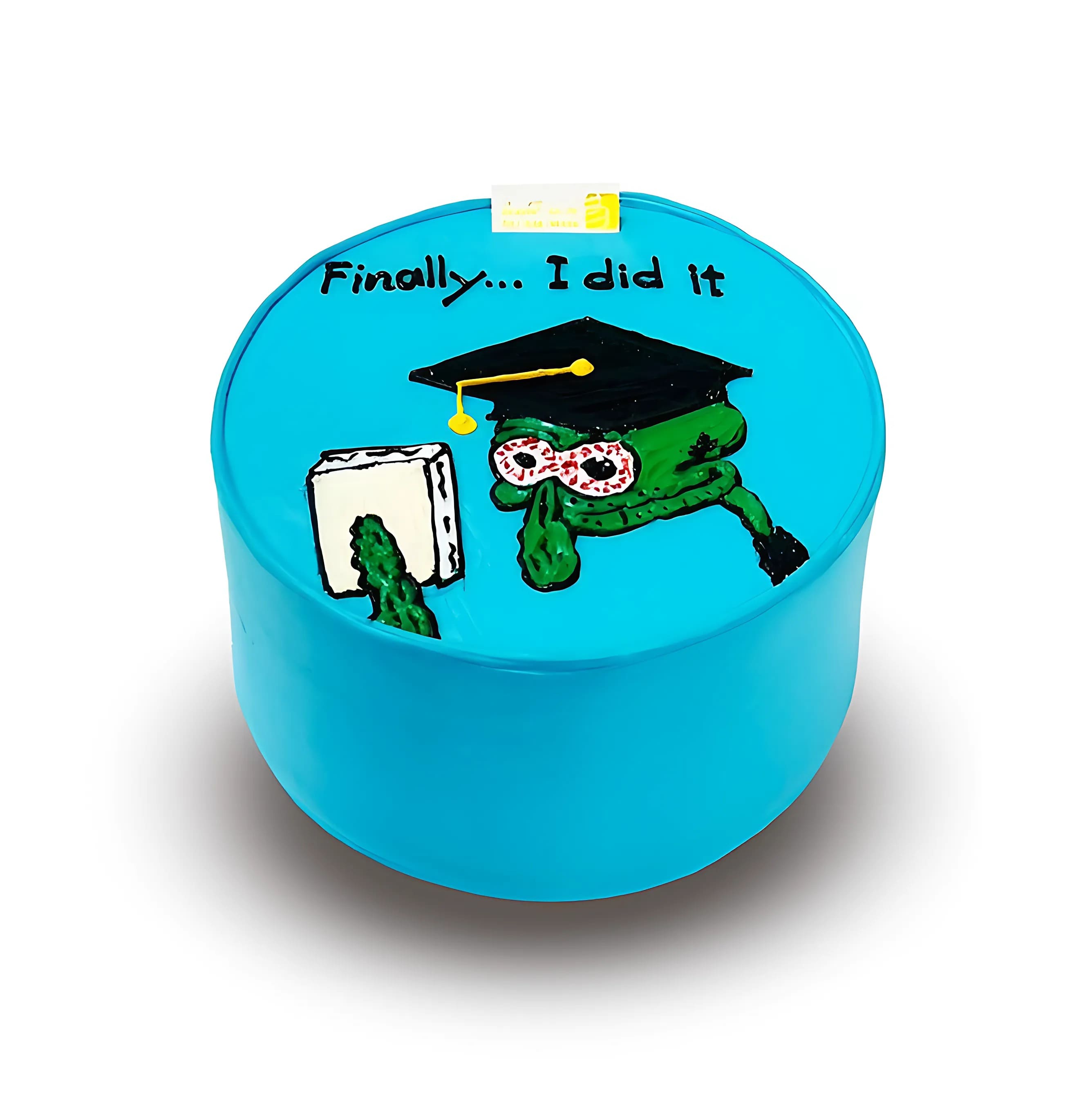 كيكة دائرية بلون أزرق زاهي، مزينة برسمة مرحة لشخصية كرتونية ترتدي قبعة تخرج وتمسك بالشهادة، مع عبارة مكتوبة: "أخيرًا... فعلتها!" (Finally... I did it). تعبر عن روح الدعابة والفرحة بالتخرج.