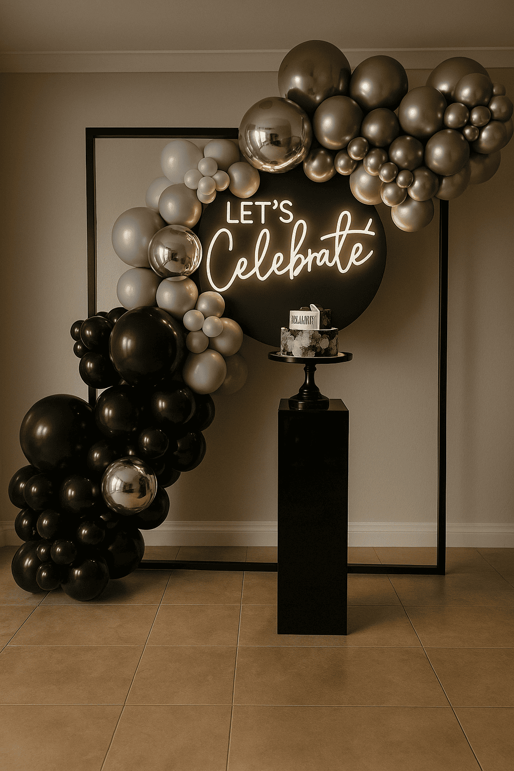 تصميم أنيق يجمع بين البالونات باللونين الأسود والفضي مع إطار معدني عصري ولافتة مضيئة "لنحتفل". تنسيق يعكس الفخامة والجرأة، مثالي لأعياد الميلاد أو المناسبات المميزة ذات الطابع الراقي.
