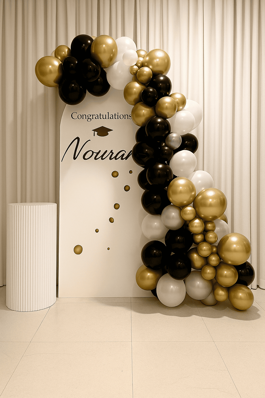 ديكور تخرج فاخر بتصميم قوس عصري مزين ببالونات باللون الأسود والأبيض والذهبي. مثالي لحفلات التخرج الراقية، حيث يبرز إنجازات التخرج ويضفي أجواء احتفالية أنيقة مع خلفية تصوير مميزة لمناسبات التخرج.