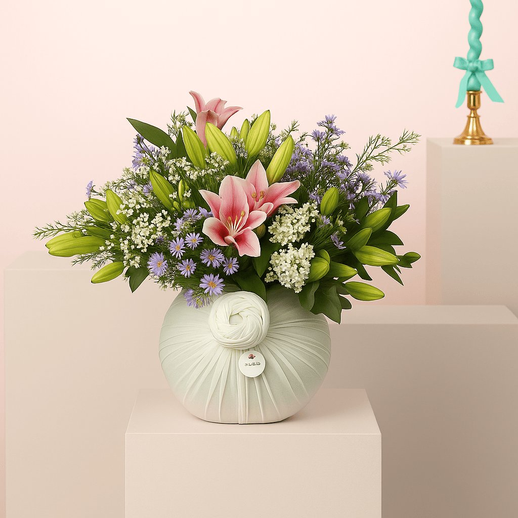 الفازة تحتوي علي ٥ ستارغيزر وردي، و٥ ليليوم أصفر، و٧ استر بنفسجي، و٧ واكس أبيض.