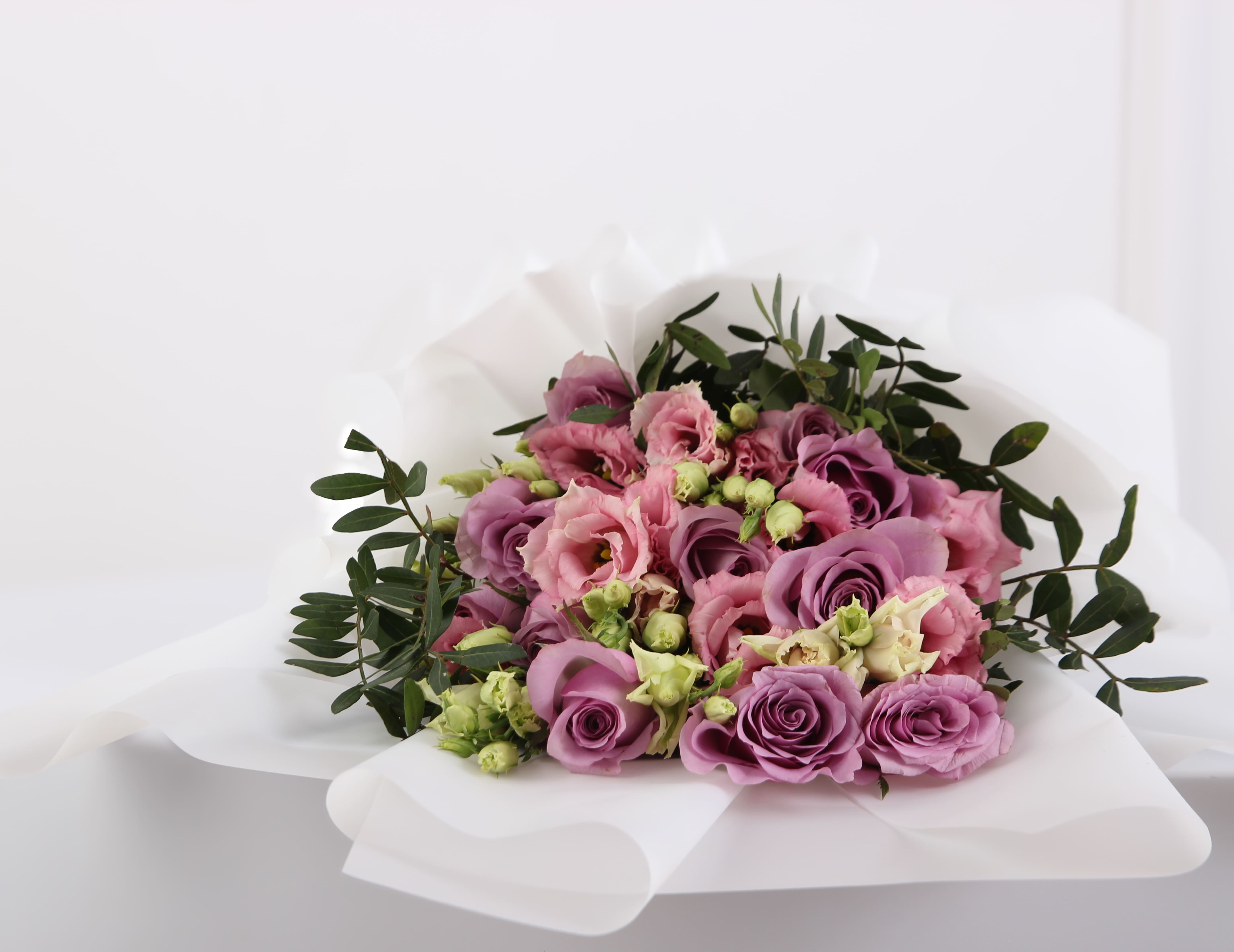 – تنسيق أنيق يضم 10 وردات موف، 5 استوما بنك، و3 فروع بستاشيا جرين، مغلفة بورق أبيض فاخر. هدية راقية تناسب كل المناسبات وتعكس الذوق والمشاعر الصادق
