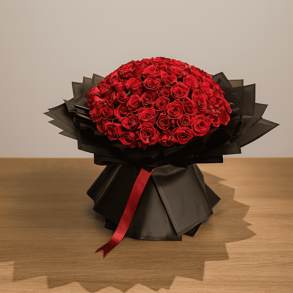 باقة فاخرة تضم 100 وردة جوري حمراء، ترمز للحب العميق وتعكس قوة المشاعر بلمسة أنيقة.