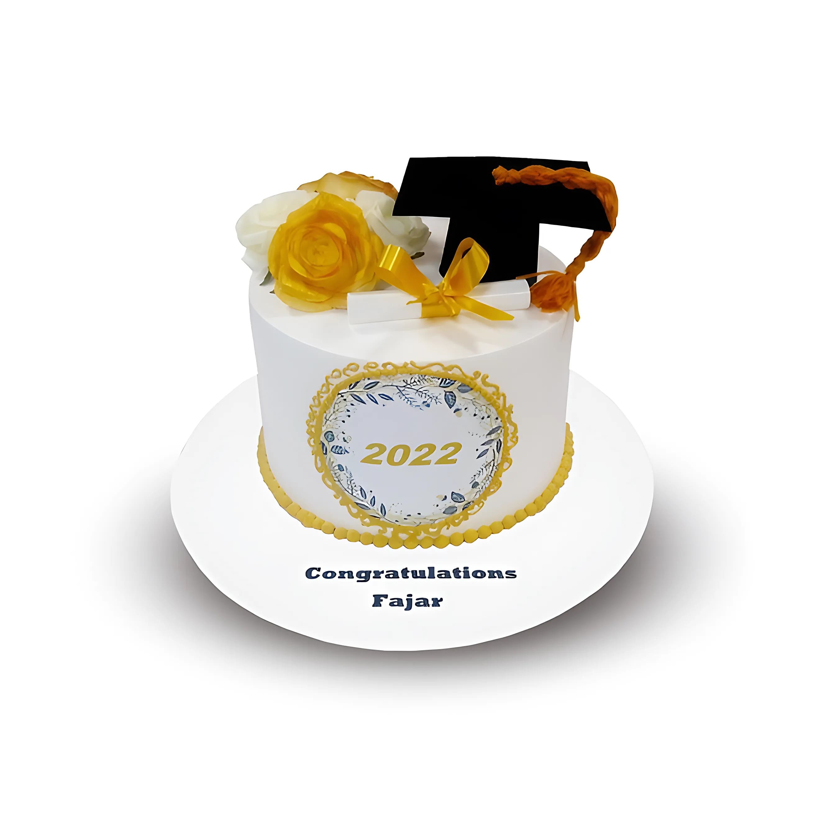 كيكة بيضاء مزينة بإطار زهري ذهبي يحمل سنة التخرج " "، مع قبعة تخرج، شهادة بشريطة ذهبية، وزهور بيضاء وصفراء. القاعدة تحمل عبارة تهنئة مكتوبة: “مبروك” تكفي لعدد ٢٠ شخص