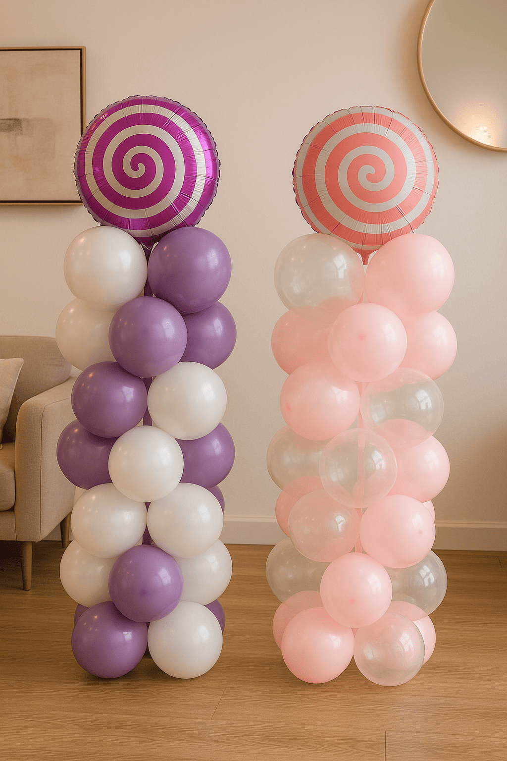 أعمدة بالونات لطيفة مستوحاة من شكل الحلوى، مع بالونات فويل دوّامة في الأعلى وتنسيق بالونات ناعمة بألوان البنفسجي والوردي والأبيض والشفاف. مثالية لإضافة لمسة مرِحة وحلوة لأي حفلة أو مناسبة.