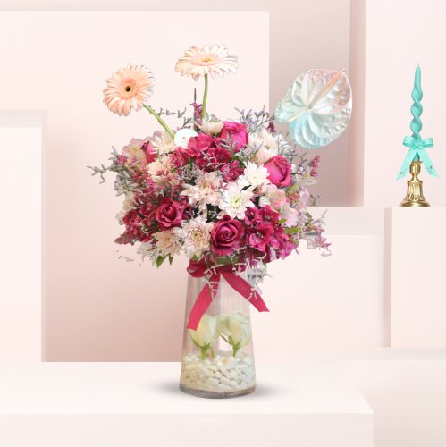 تشكيلة أنيقة من الورود الوردية والجرجيريات مع لمسات ناعمة داخل مزهرية مزينة بالأحجار. هدية مثالية لأعياد الميلاد والمناسبات أو لإضافة لمسة أنثوية منعشة للمكان.