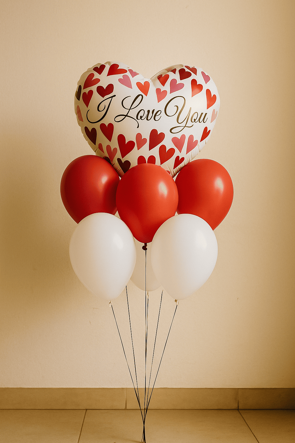 باقة رومانسية تضم بالون قلب مكتوب عليه “I Love You” مع بالونات لاتكس حمراء وبيضاء. مثالية للذكرى، والمفاجآت الرومانسية. تنسيق بسيط وأنيق يعبر عن الحب بطريقة مميزة ومؤثرة.