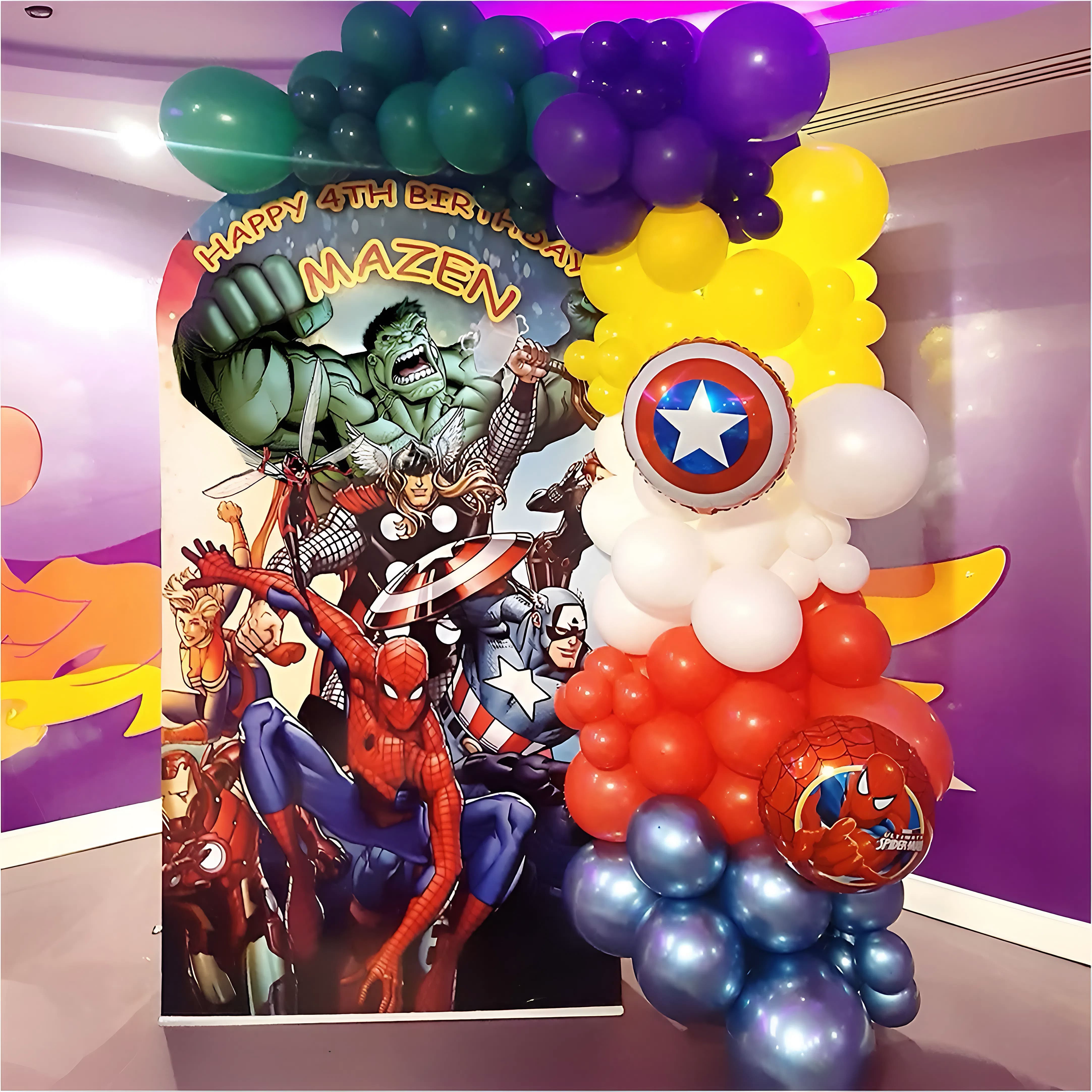 تجهيز عيد ميلاد أفنجرز رائع مع شخصيات هالك وسبايدرمان وكابتن أمريكا. ديكور مثالي لحفلات الأطفال ولمسات تضيف حماساً لحفل عيد ميلاد مميز. مناسب لأي احتفال ممتع محبّ للأبطال.