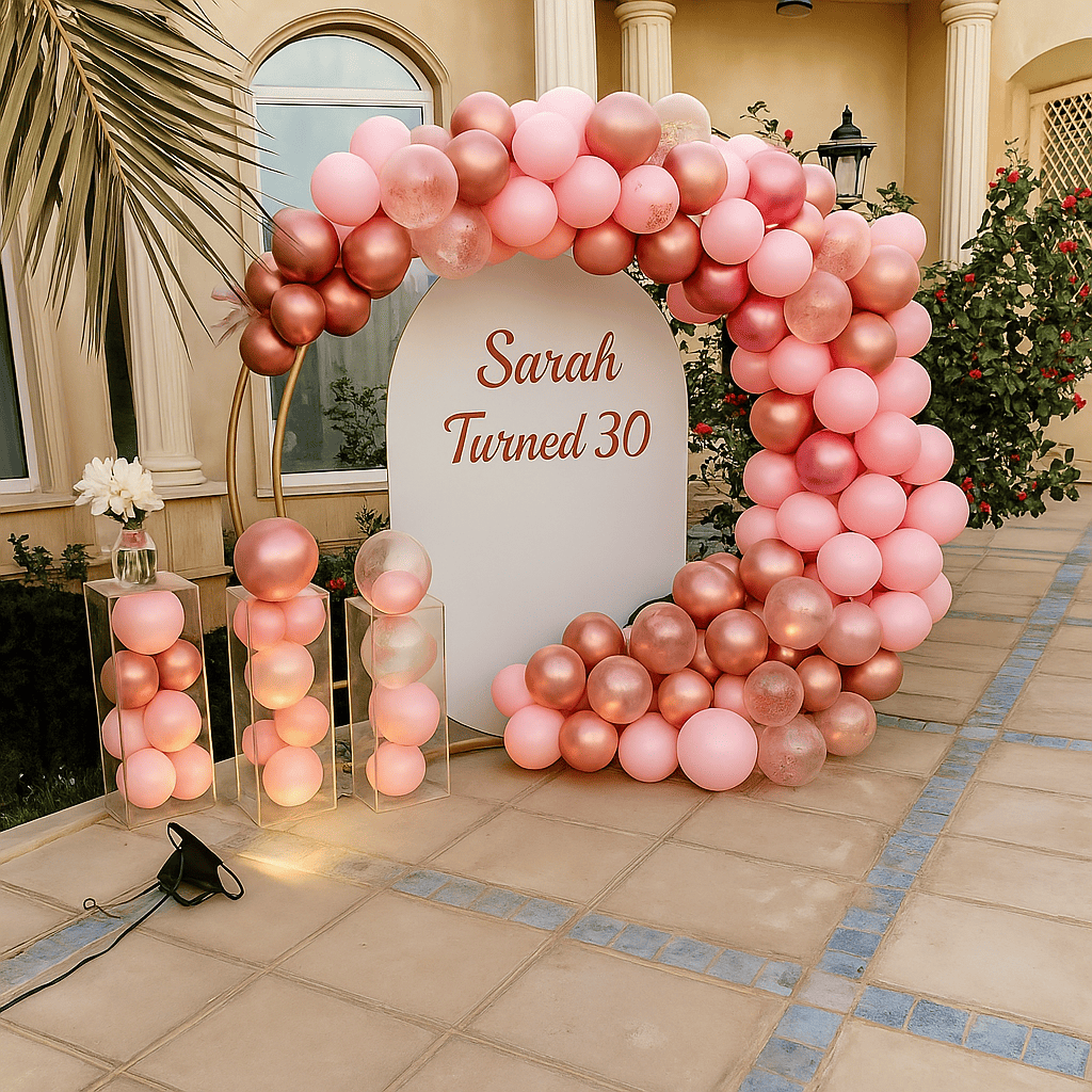 ديكور عيد ميلاد أنيق بعمر الثلاثين مع بالونات باللون الوردي والذهبي الوردي، مناسب لصنع أجواء احتفال جميلة. مثالي لإضافة لمسة راقية وديكور مميز لأي حفل عيد ميلاد.ديكور عيد ميلاد أنيق بعمر الثلاثين مع بالونات باللون الوردي والذهبي الوردي، مناسب لصنع أجواء احتفال جميلة. مثالي لإضافة لمسة راقية وديكور مميز لأي حفل عيد ميلاد.