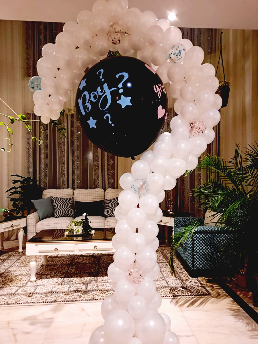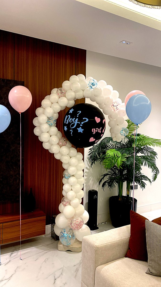 باقة بالون مخصصة لتحديد جنس المولود مكونة من بالون علامة استفهام وبالون ٣٦ انش مع قصاصات ملونة باللون الازرق أو الوردي