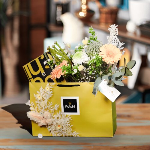 حقيبة هدايا من باتشي تحتوي على شوكولاتة فاخرة وتنسيق ورد لطيف بألوان الباستيل مع لمسات خضراء أنيقة. هدية جاهزة ومثالية لأعياد الميلاد والمناسبات الخاصة وتقديم الشكر.