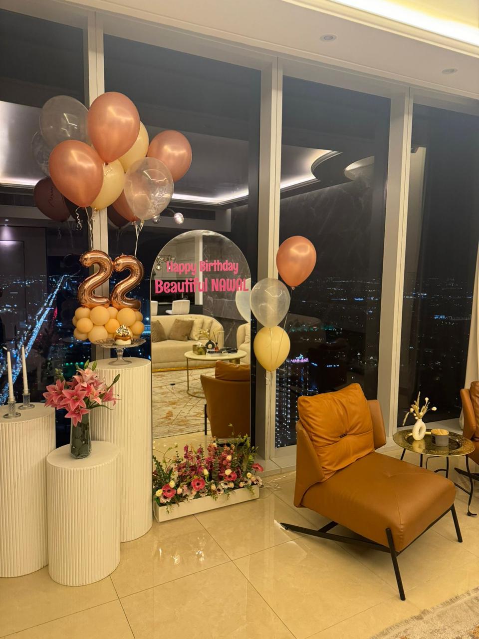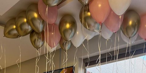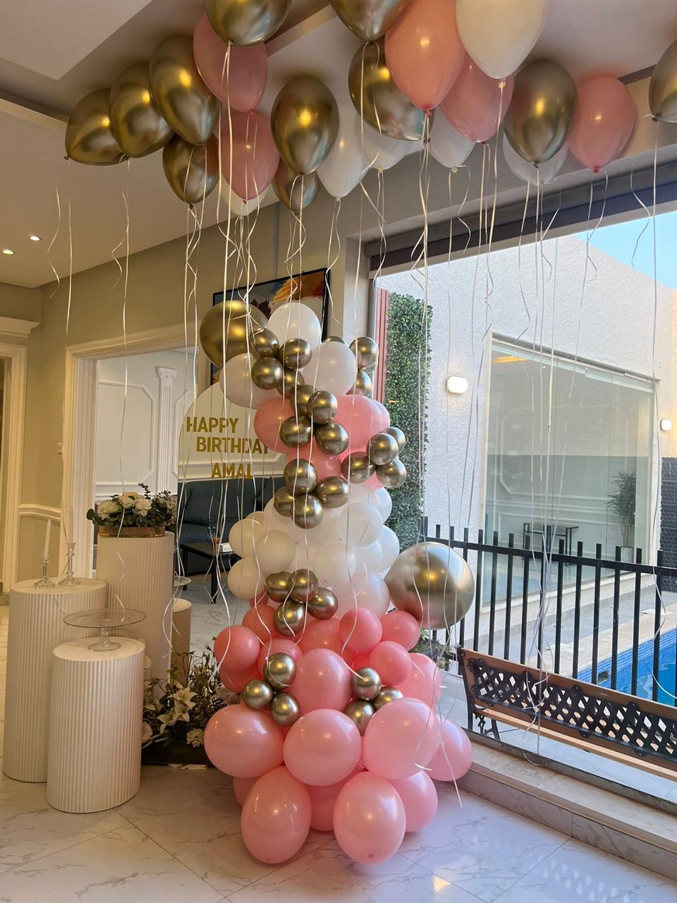 تنسيق بالونات أنيق يجمع بين الوردي والأبيض والذهبي مع بالونات هيليوم معلّقة. مثالي لحفلات أعياد الميلاد داخل المنزل، ويضيف لمسة فاخرة وزاوية تصوير مميزة لأي مناسبة.تنسيق بالونات أنيق يجمع بين الوردي والأبيض والذهبي مع بالونات هيليوم معلّقة. مثالي لحفلات أعياد الميلاد داخل المنزل، ويضيف لمسة فاخرة وزاوية تصوير مميزة لأي مناسبة.