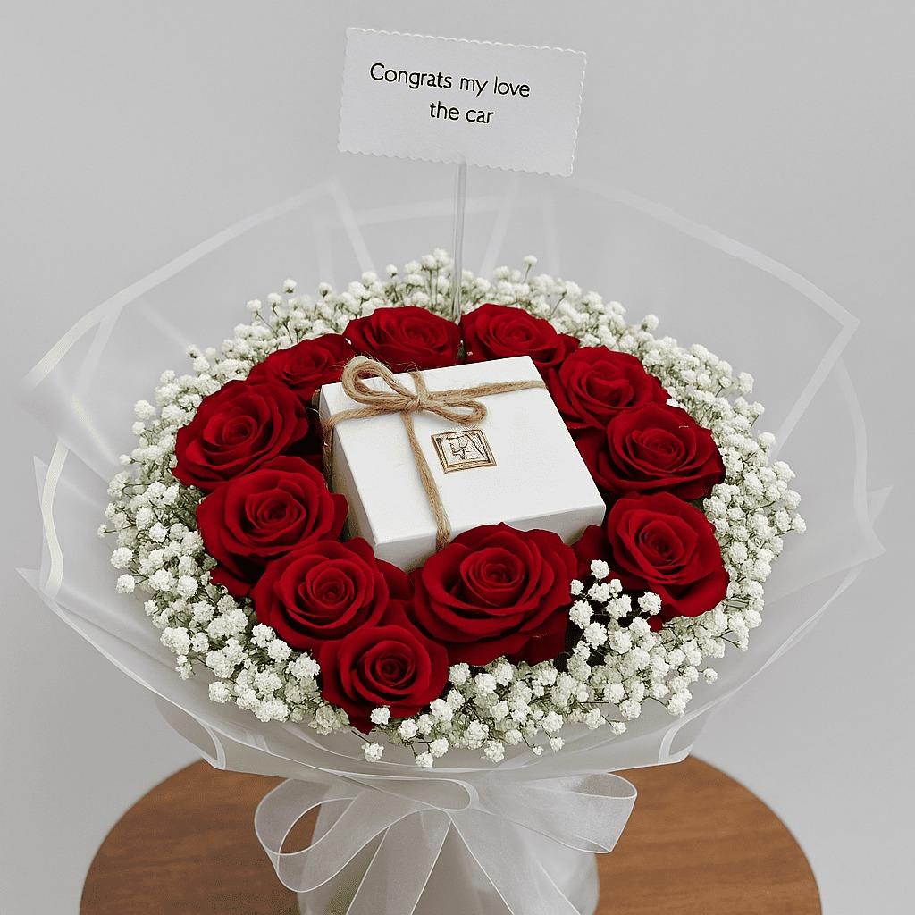 باقة ورد مُكون من الجوري الأحمر ومُزين بالقرنفل الأبيض مع بوكس صغير من الشكولاته