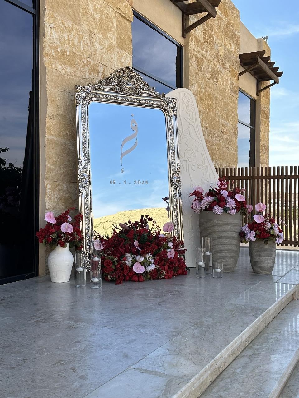 مدخل فعالية فاخر بتصميم لوحة ترحيبية مزينة بمرآة فاخرة وتنسيقات زهور أنيقة، مناسب لحفلات الزواج والخطوبة والمناسبات الخاصة ليمنح الضيوف انطباعًا أوليًا مميزًا ورقيًا.