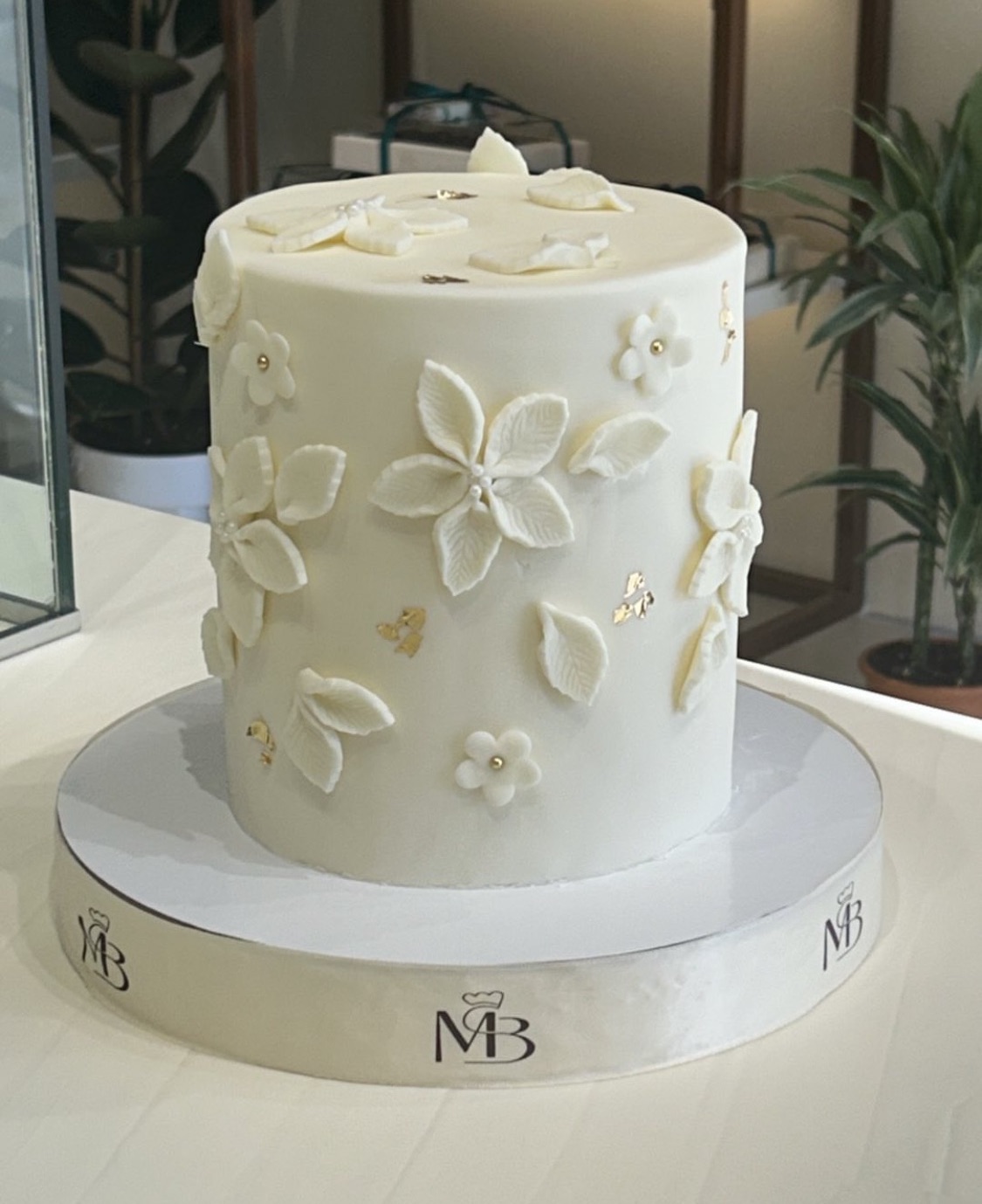 كيكة فاخرة باللون الكريمي مزينة بزهور وأوراق ناعمة بلمسات ذهبية أنيقة. تصميم أنثوي وراقي يناسب أرقى المناسبات.