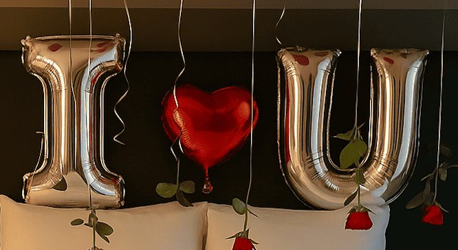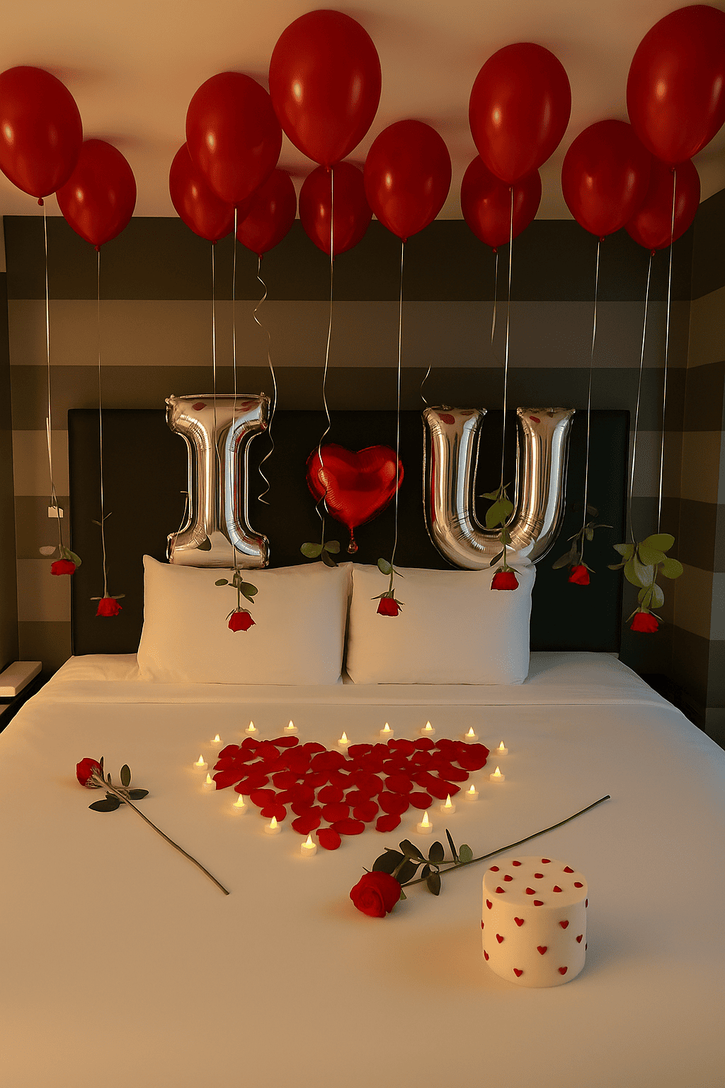 تجهيز رومانسي بغرفة النوم مع بالونات حمراء، حروف “I ❤️ U”، ورود معلّقة، قلب من الورد والشموع. مثالي للمفاجآت،، أو لحظات رومانسية خاصة.