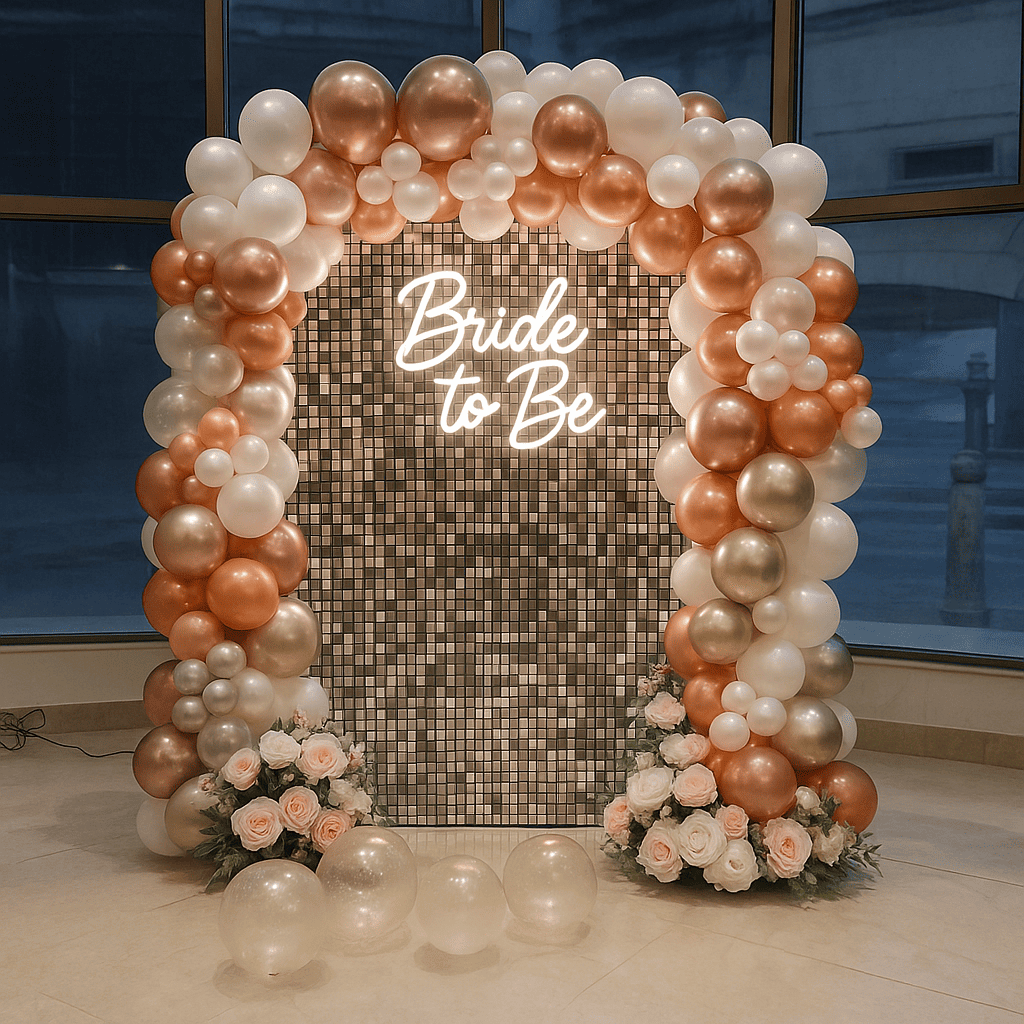 ثيم العروس الذهبي يضيف لمسة رومانسية وفخمة لحفلات توديع العزوبية والملكة. بالونات باللون الوردي الذهبي والأبيض مع تنسيق وردي أنيق، مثالي للاحتفال بالعروس بأجواء راقية وفرح وذكريات ما تنسى.
