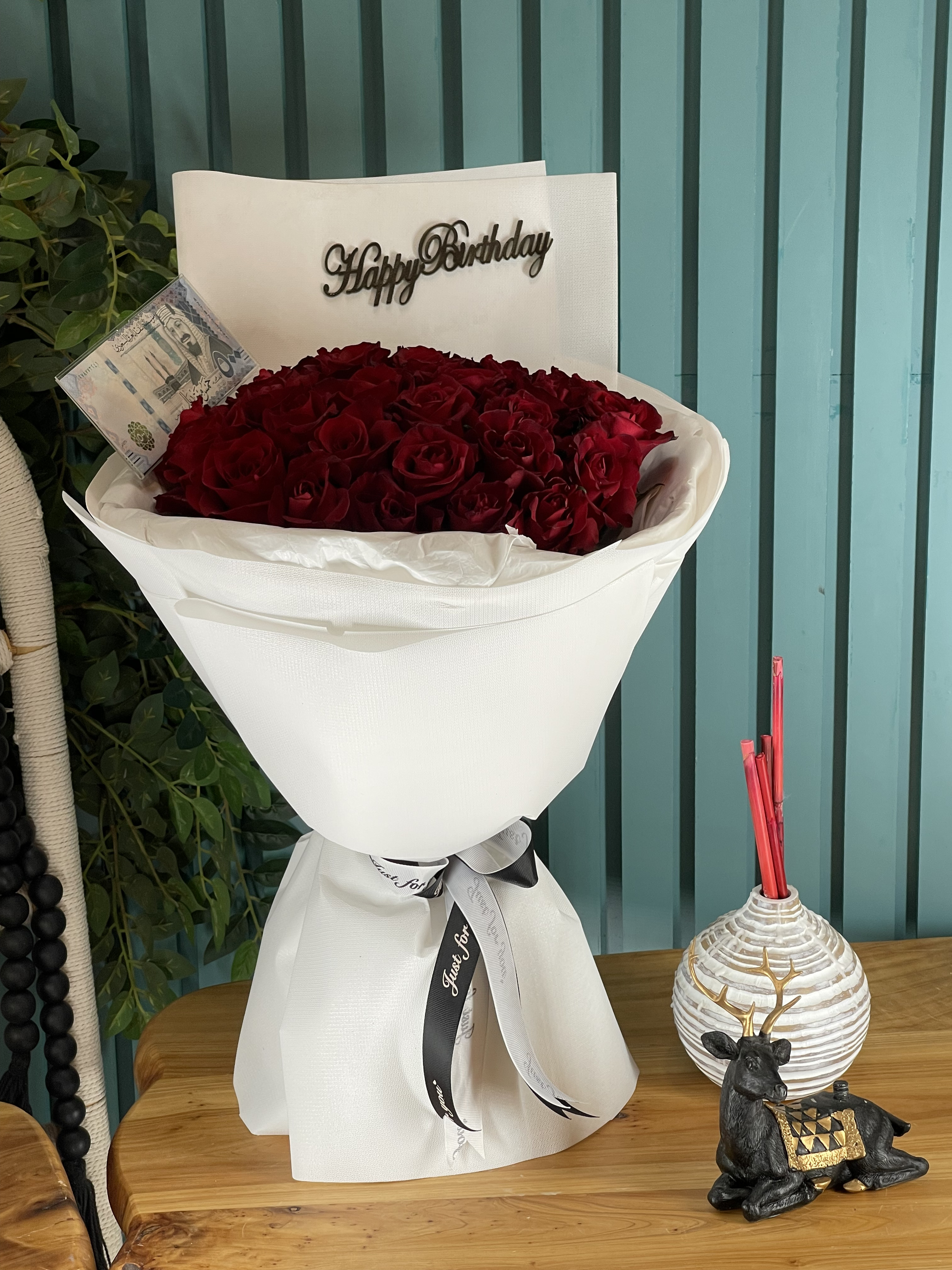 باقة متناسقة من الورد الأحمر الغامق بتغليف أبيض أنيق، مرفقة بتاج تهنئة .