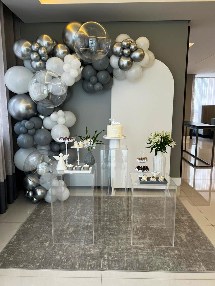 تنسيق راقٍ يجمع بين البالونات الفضية والبيضاء مع حوامل أكريليك وقوس عصري أنيق. مثالي لأعياد الميلاد أو الخطوبة أو حفلات الزفاف الصغيرة. تصميم بسيط وفخم يعكس الأناقة في كل تفصيل.تنسيق راقٍ يجمع بين البالونات الفضية والبيضاء مع حوامل أكريليك وقوس عصري أنيق. مثالي لأعياد الميلاد أو الخطوبة أو حفلات الزفاف الصغيرة. تصميم بسيط وفخم يعكس الأناقة في كل تفصيل.