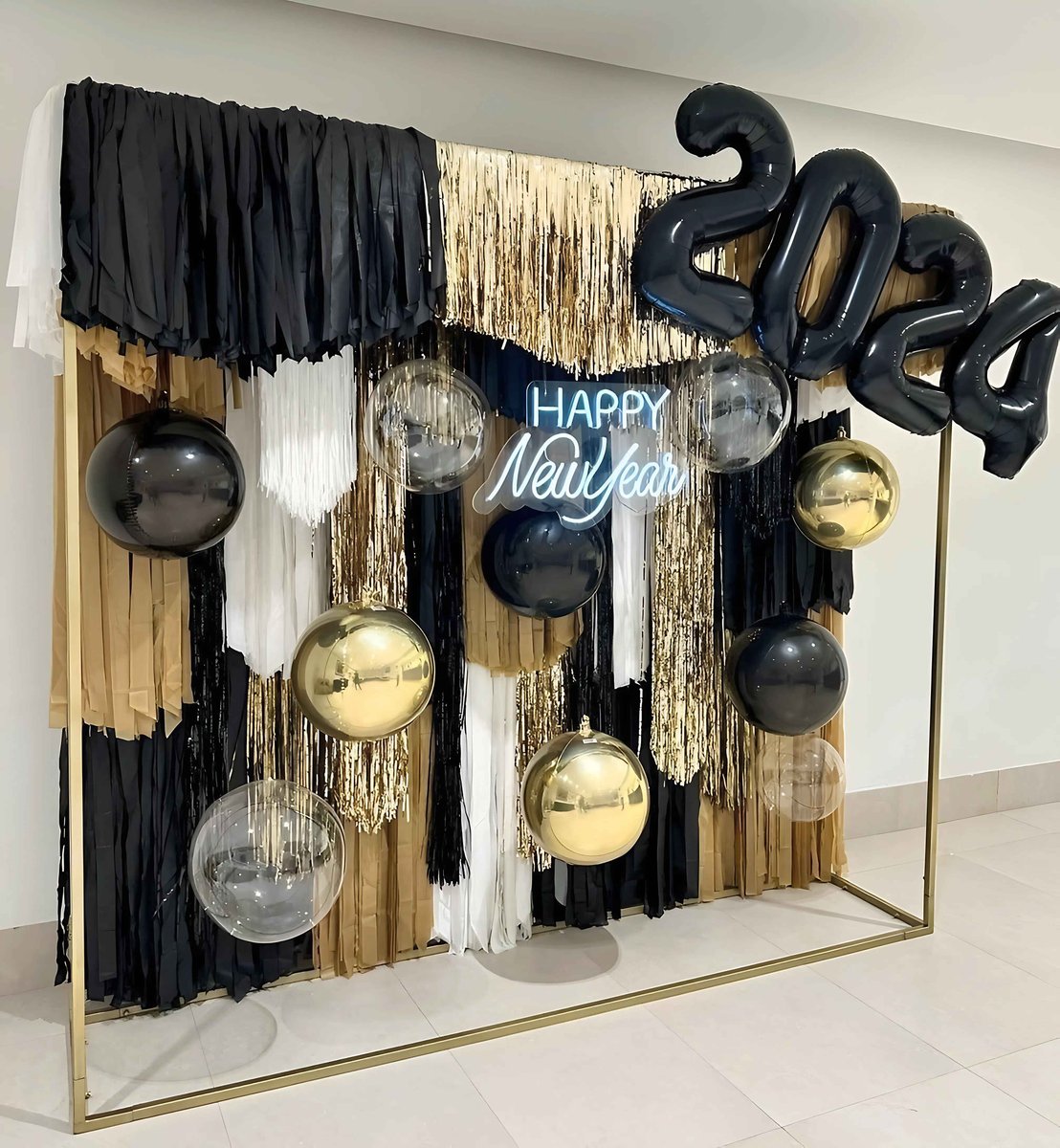 ركن احتفالي للسنة الجديدة بتصميم يجمع الشرائط السوداء والذهبية والبيضاء مع بالونات لامعة ولافتة مضيئة "Happy New Year". تنسيق أنيق يضيف أجواءً مبهجة لأي للإحتفال