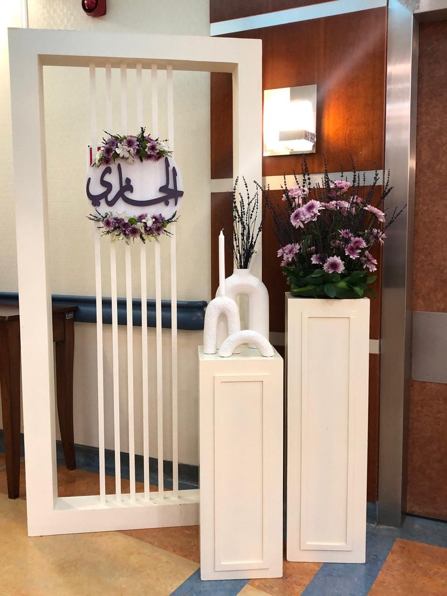تصميم استقبال مواليد عصري باللون الأبيض ولمسات من الزهور البنفسجية الناعمة. ديكور بسيط وأنيق مثالي للمستشفى أو البيت، يعطي إحساس بالفخامة والرقي بأجواء هادئة وجميلة ترحب بالمولود بأناقة.