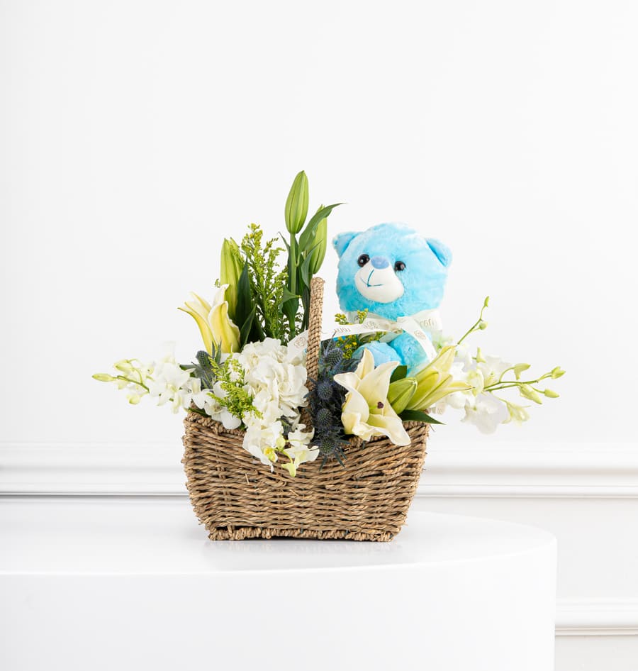 سلة منسوجة يدويًا تحتوي على هيدرنجا وليليوم وأوركيد أبيض مع أرنجيوم أزرق، ودبدوب أزرق لطيف. هدية مميزة لاستقبال المولود الجديد والتعبير عن الفرح والتهنئة بأسلوب راقٍ وناعم