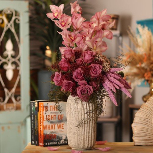 مزهرية رخام فاخرة بها زهرة السمبيديوم و مجموعة من الروز الموف واكسسوار هولندي.