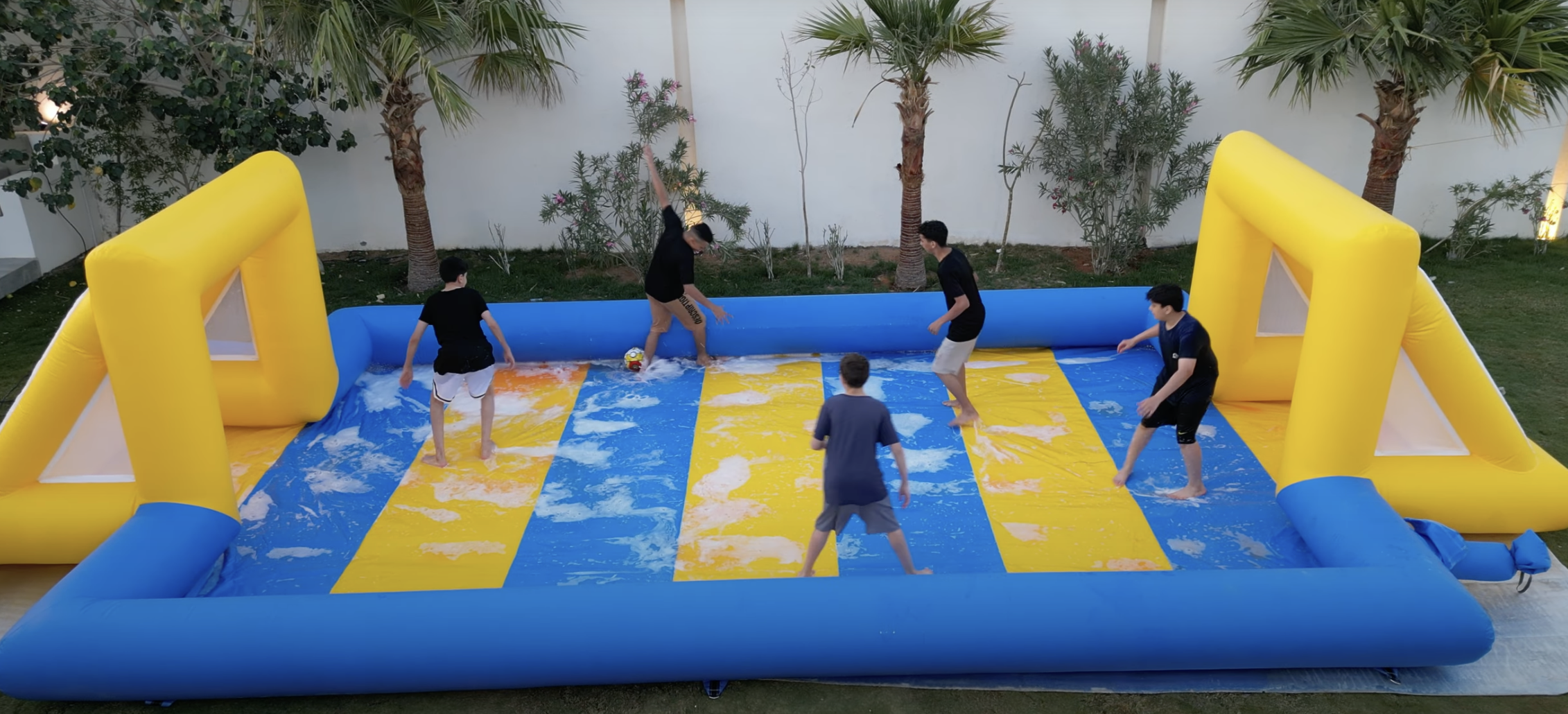 ملعب كرة قدم مائي قابل للنفخ بتصميم مخطط، يمنح تجربة لعب فريدة وممتعة. **الأبعاد:** * الطول: 20 متر * العرض: 10 أمتار * الارتفاع: 2 متر