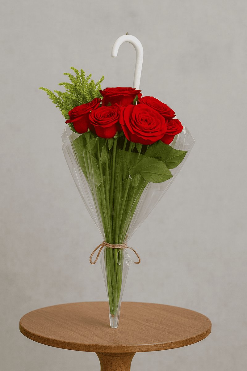 باقة مبتكرة بتنسيق مظلة تضم وردًا أحمر طازجًا مع لمسة خضراء جميلة، مغلّفة بشفافية أنيقة ومربوطة بحبل طبيعي. هدية مميّزة للمفاجآت وأعياد الميلاد ولمسات الحب اللطيفة.