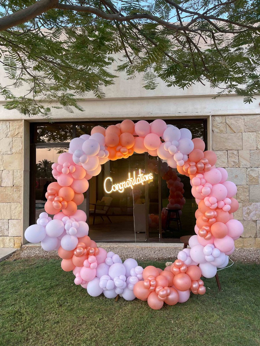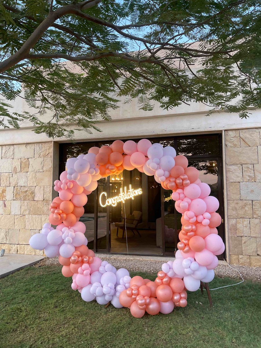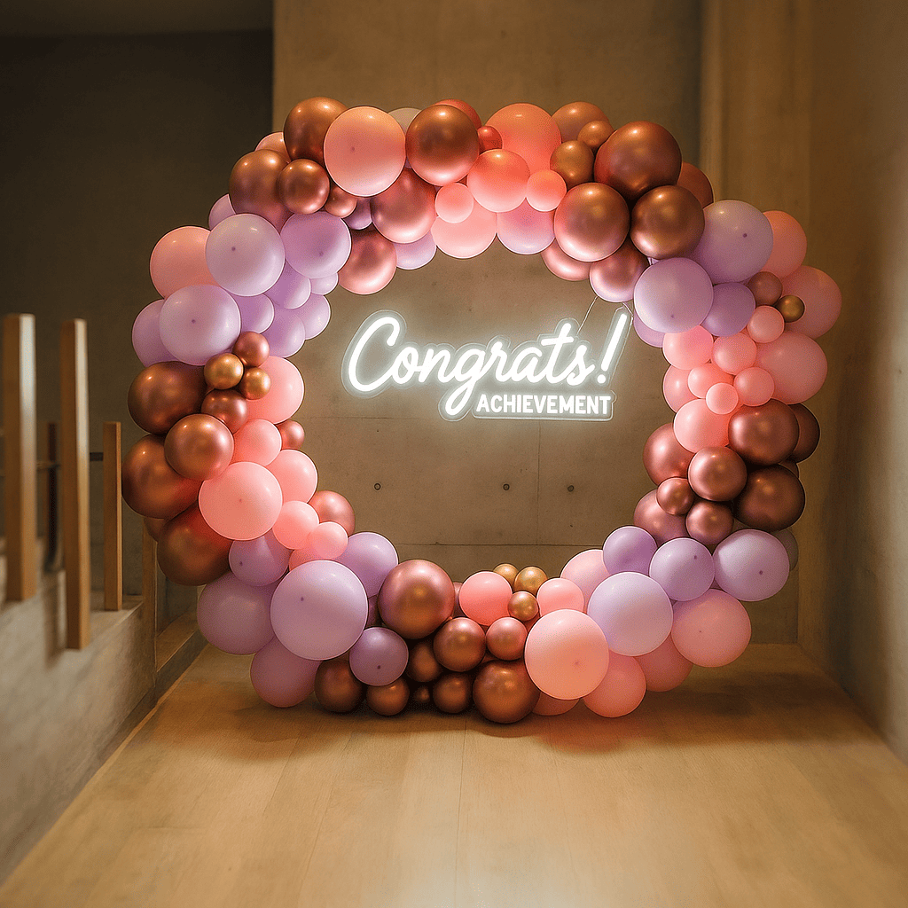 حلقة بالونات عصرية مصممة لإبراز احتفالات التخرج بأسلوب أنيق وألوان ناعمة. يمكن استخدام هذا التنسيق أيضًا في حفلات عيد الميلاد، ديكور عيد ميلاد مميز، أعياد ميلاد الأطفال، وتنظيم أجواء احتفال راقية لمناسبات خاصة واحتفالات داخلية.