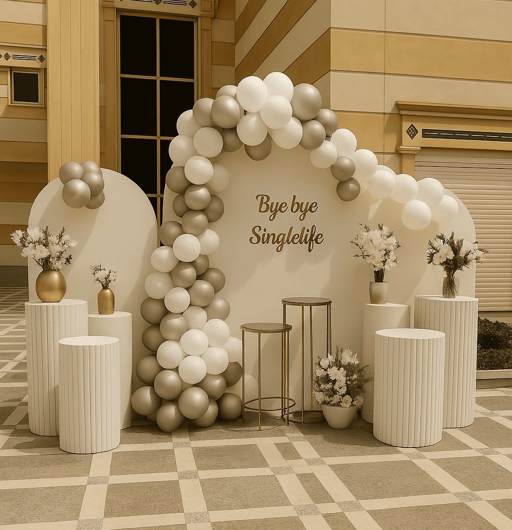 ثيم باي باي سنقل بتصميم أنيق وعصري يحتفل ببداية مرحلة جديدة. مزين ببالونات باللون الأبيض والشامبين ولمسات ورد، مثالي لحفلات توديع العزوبية والملكة. ديكور بسيط وفخم يعطي أجواء مميزة مليانة فرح وأناقة.ثيم باي باي سنقل بتصميم أنيق وعصري يحتفل ببداية مرحلة جديدة. مزين ببالونات باللون الأبيض والشامبين ولمسات ورد، مثالي لحفلات توديع العزوبية والملكة. ديكور بسيط وفخم يعطي أجواء مميزة مليانة فرح وأناقة.