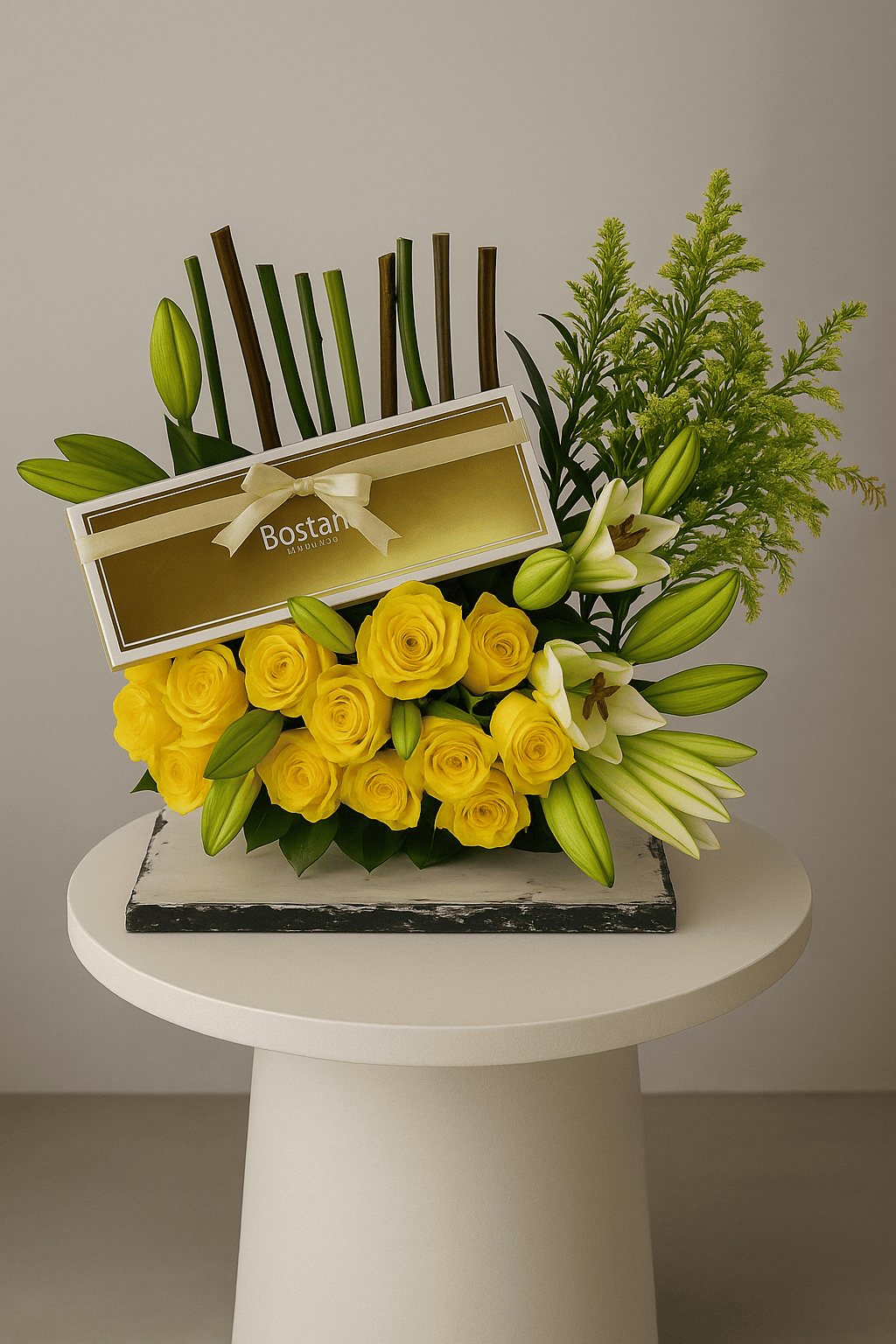 بكج ورود طبيعية ذات ألوان هادئة مع شوكليت بستاني ، مثالية كهدية للتهنئة والمناسابات يتوفر كتابة كرت باللغة العربية والإنجليزية، الرجاء كتابة المطلوب طباعته في الملاحظات