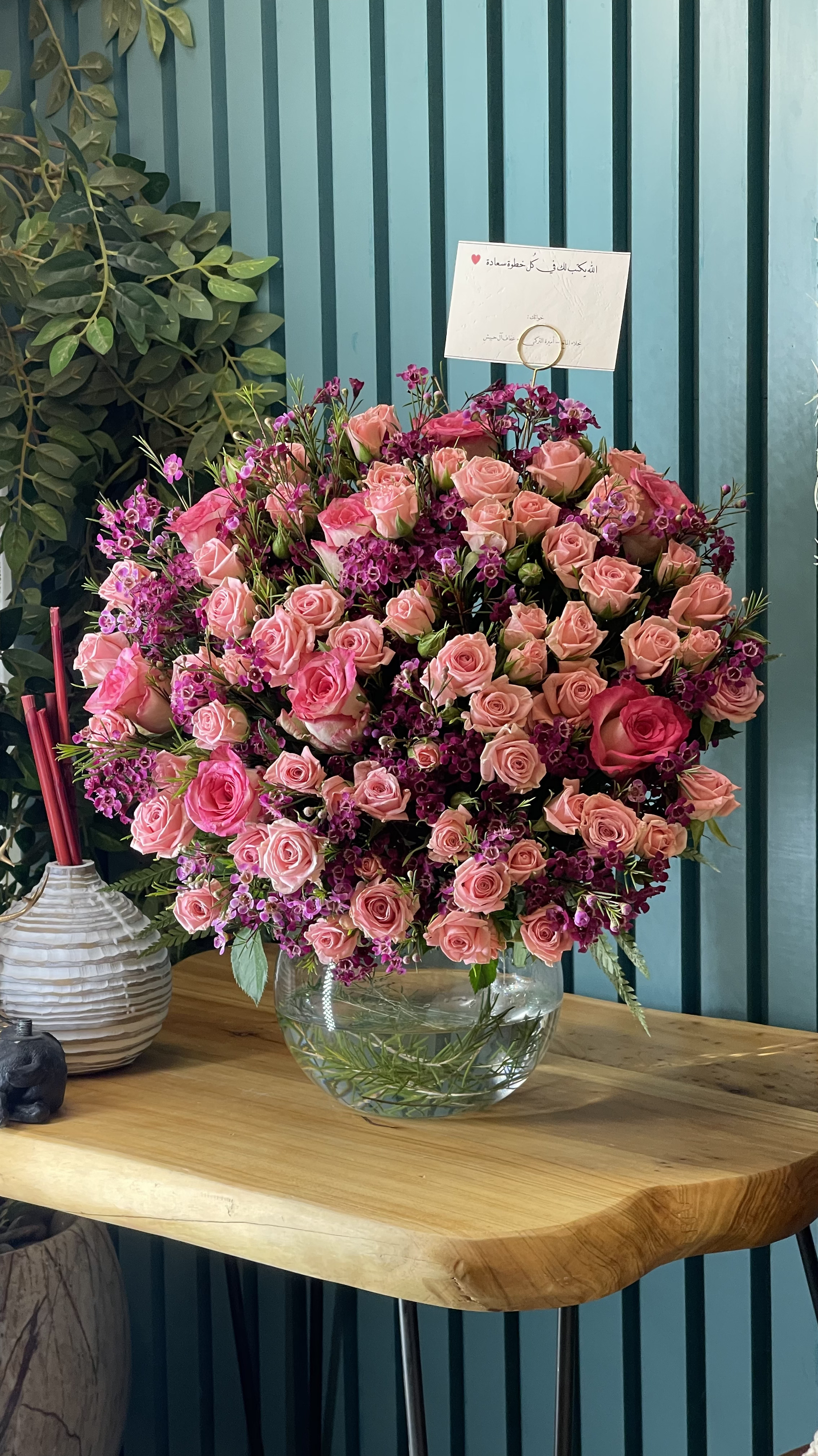 فازة زجاجية مستديرة تحتوي على أكثر من ١٠٠ وردة وردية مع زهور شمعية بتدرجات ناعمة تنسيق قوي ومتوازن في قاعدة مائية طبيعية.