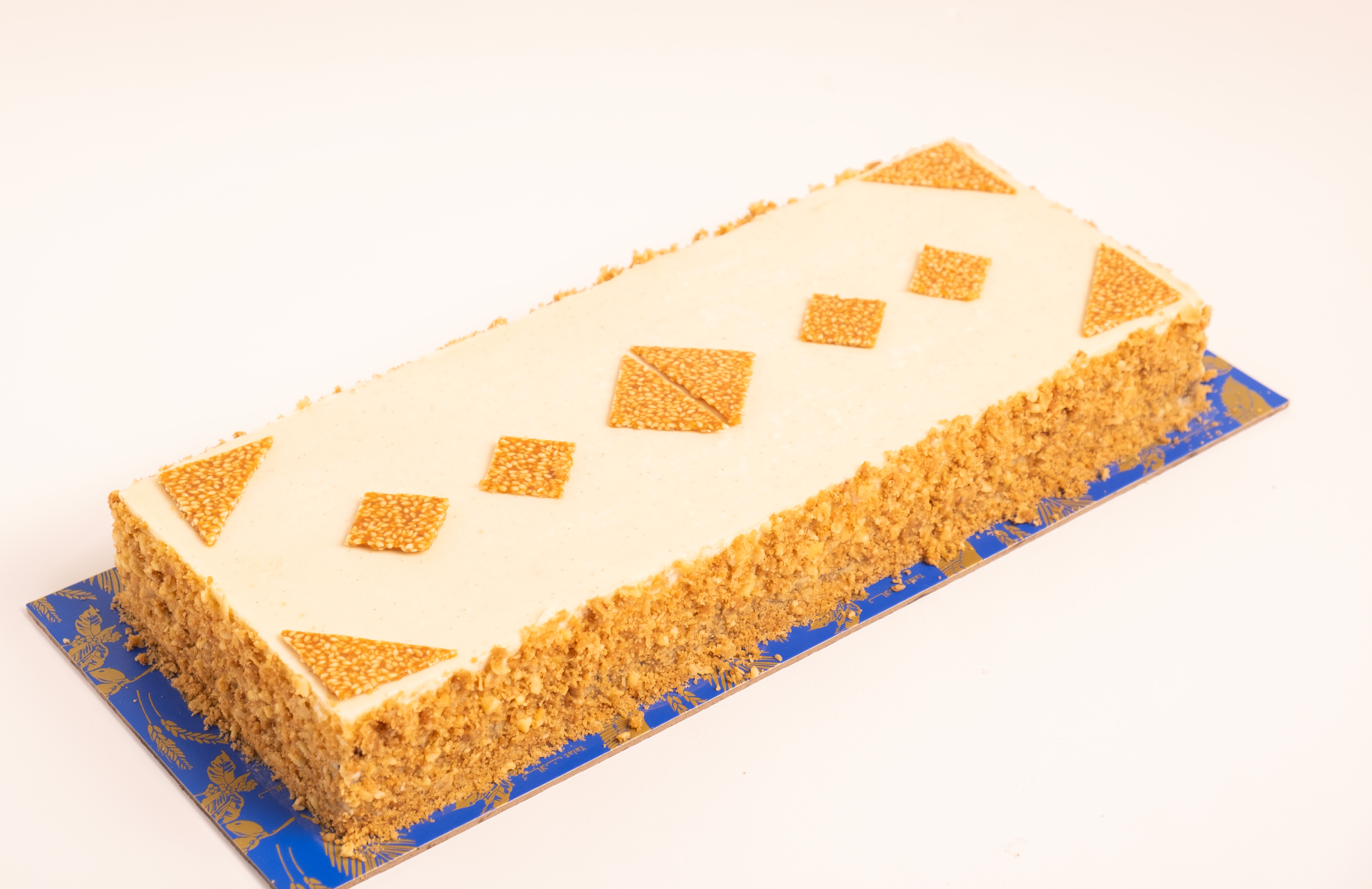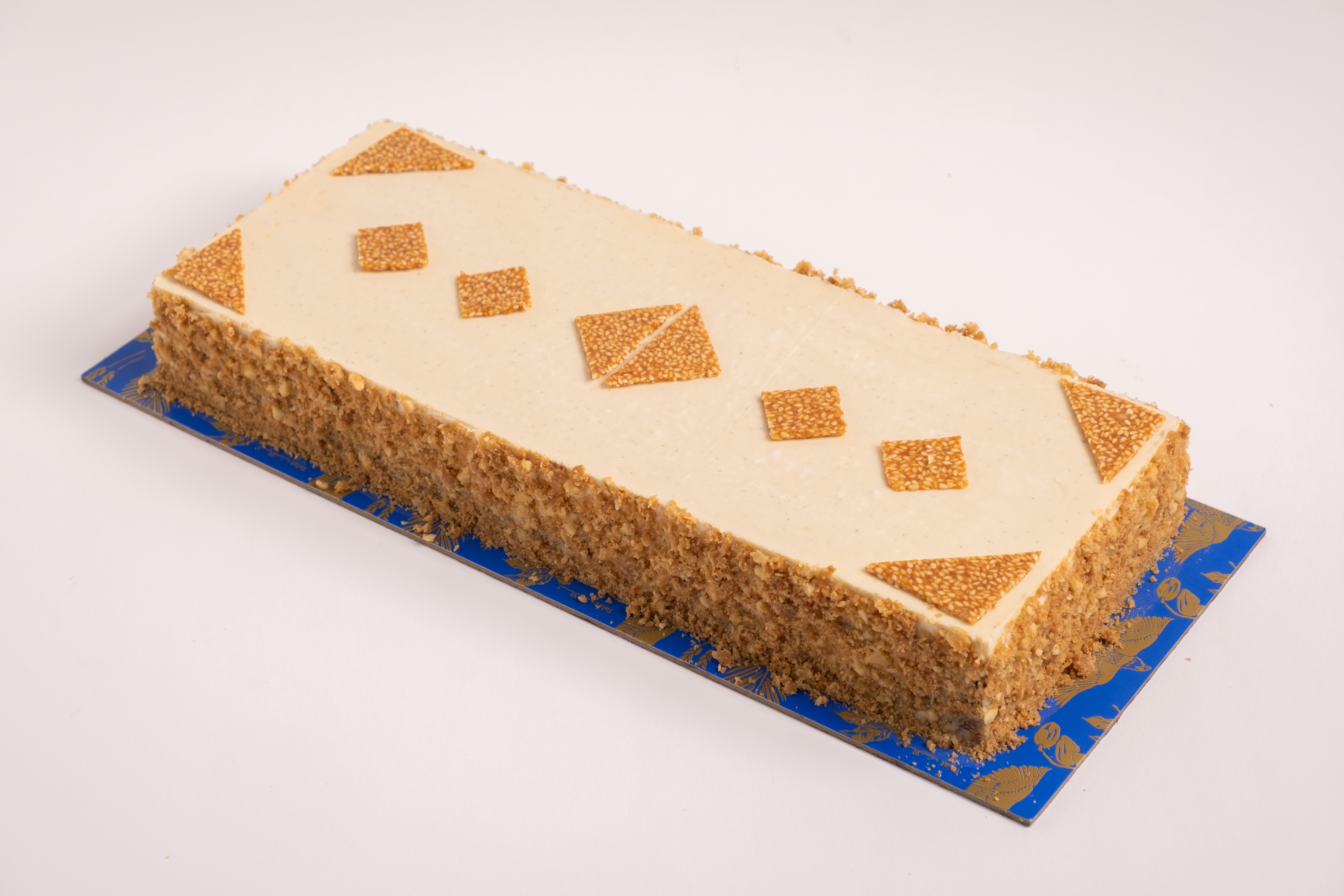 طبقات من كيك الطحينة السوداء مع مزيج من طبقة الشوكولاتة الغامقة وطبقة من مربى التمر الفاخر و المغطى بطبقة من كريمة الطحينة اللذيذة.