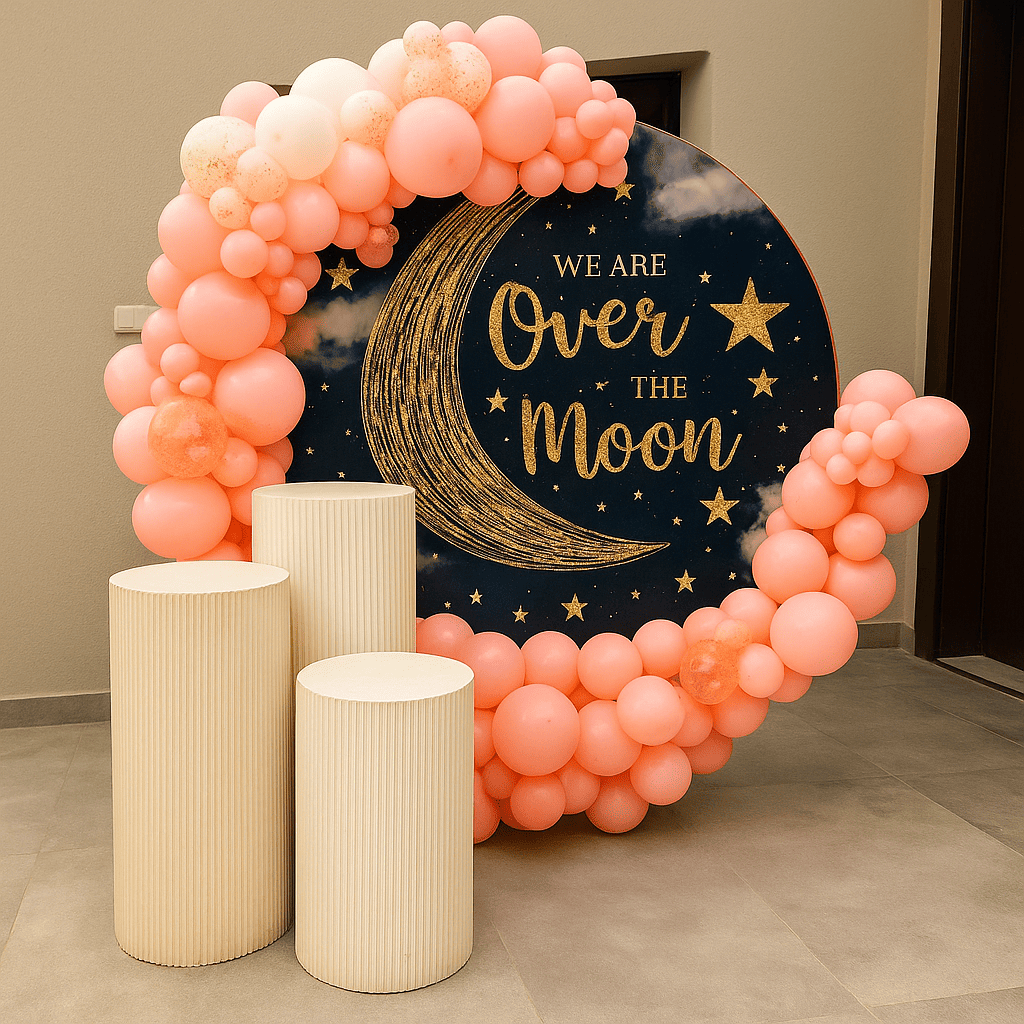 ديكور “ميلاد القمر” يضيف لمسة حالمة لأي مناسبة. بتدرجات الخوخ الناعمة ولمسات النجوم الذهبية، الأجواء كلها تشع دفئًا وسحرًا. مثالي لحفلات الاستقبال أو أعياد الميلاد أو أي لحظة تستحق أن تلمع مثل القمرديكور “ميلاد القمر” يضيف لمسة حالمة لأي مناسبة. بتدرجات الخوخ الناعمة ولمسات النجوم الذهبية، الأجواء كلها تشع دفئًا وسحرًا. مثالي لحفلات الاستقبال أو أعياد الميلاد أو أي لحظة تستحق أن تلمع مثل القمر